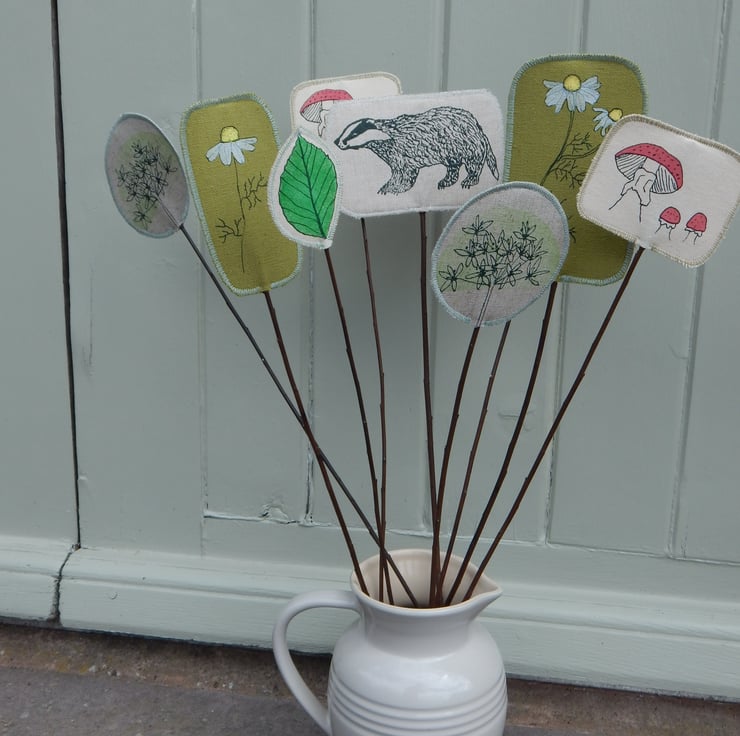 This is a bouquet of 9 fabric on willow creations. Each is double sided with interfacing for stability. They are all have running stitch and then a zig zig stitched finishing to ensure fraying is kept to a minimum. They are then hand glued onto willow which measures about 30 cm in length.