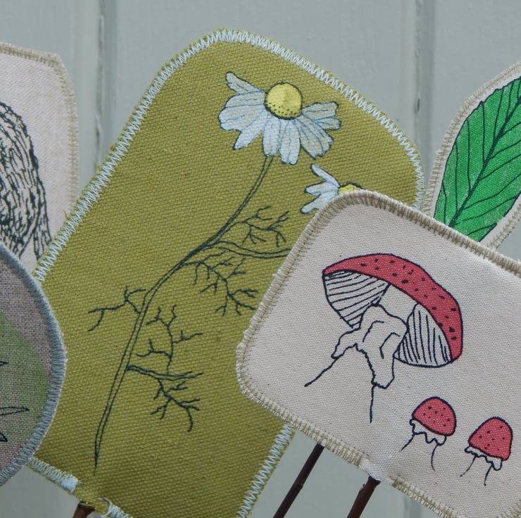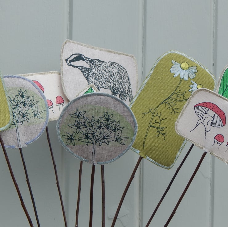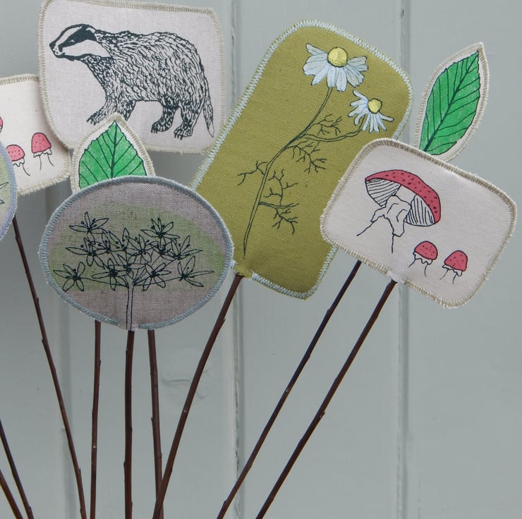 There are is 1 badger screen printed. There are daisy panels, that have been screen printed and then hand painted. There are 2 red toadstools with lino prints for a pop of red. There are 2 beech leaves again screen printed and then hand painted. There are 2 round wild garlic with lino prints for a green background.