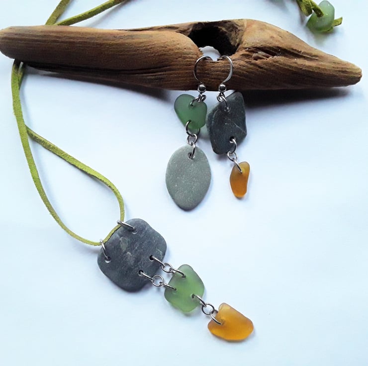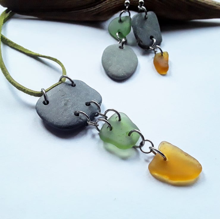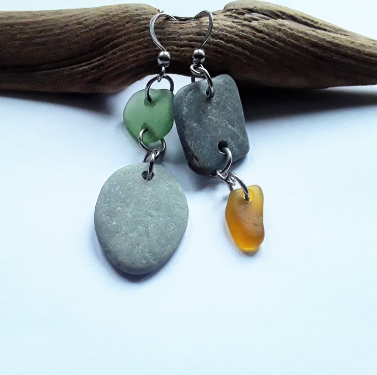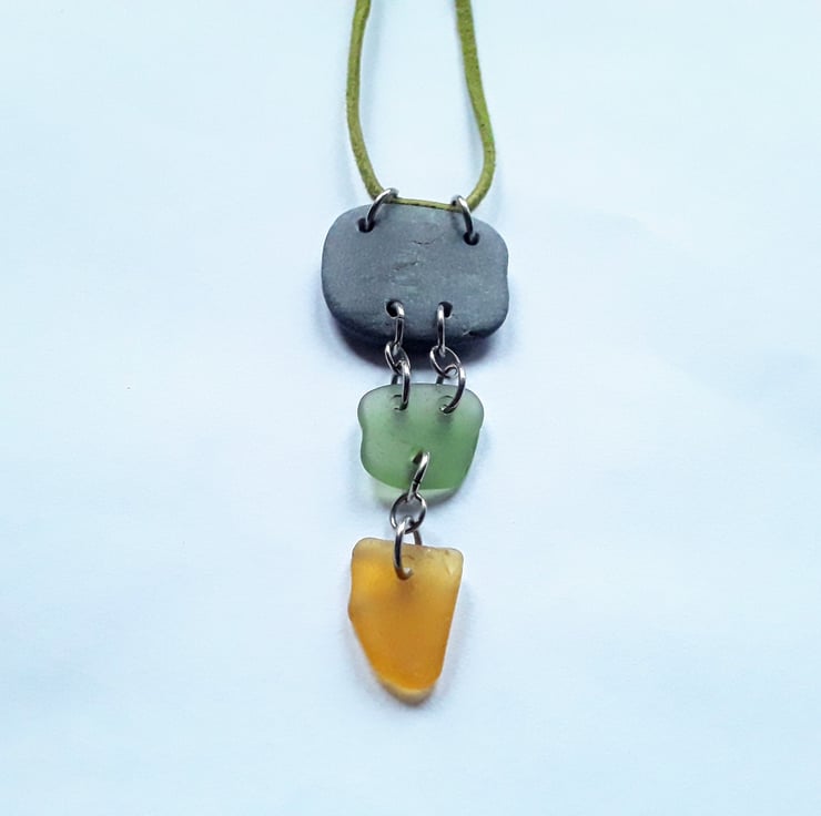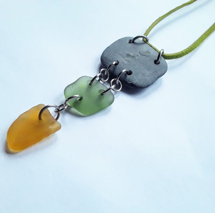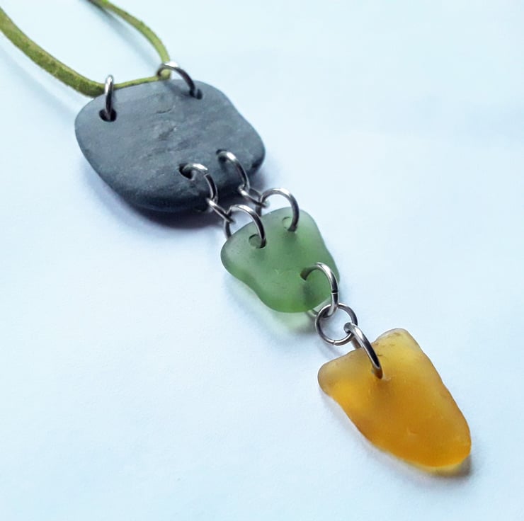 A naturally smoothed piece of square-ish beach slate has been hand-drilled, with square-ish sage green and triangular orange seaglass pieces added, to create a three tiered drop pendant. Stainless steel jumprings link each of the pieces together.