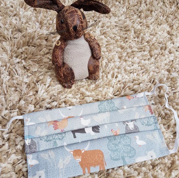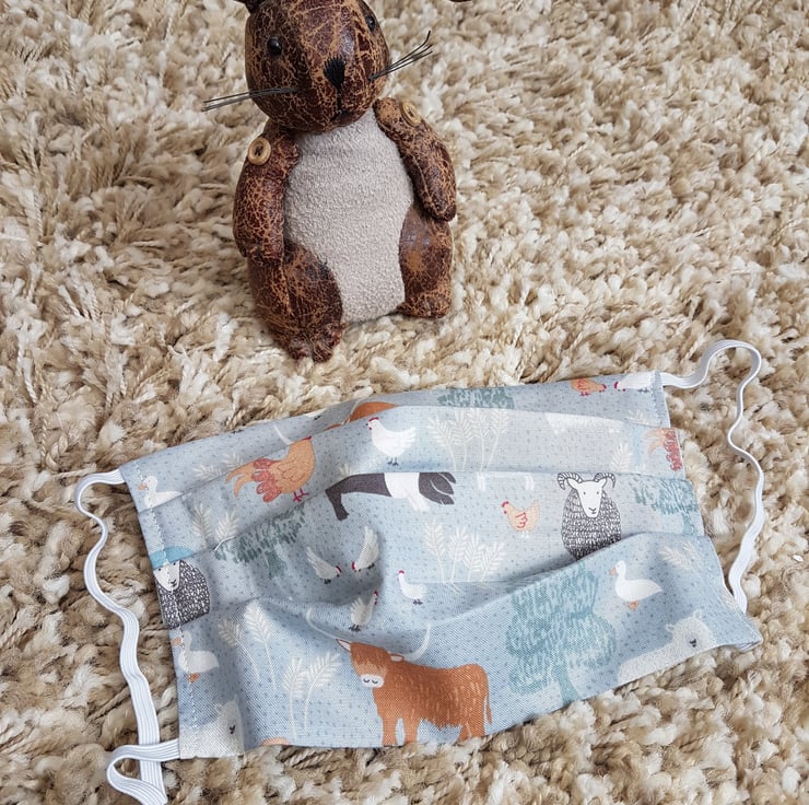 Small Adult/Teenager face covering/mask made from a farmyard print on grey cotton. The face mask is made with 2 layers of cotton forming an inner pocket for a filter (not included) and is fastened over the ears with 2 loops of elastic.