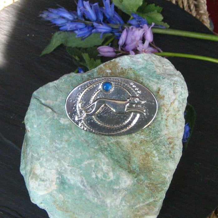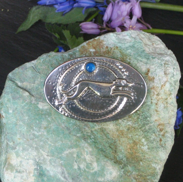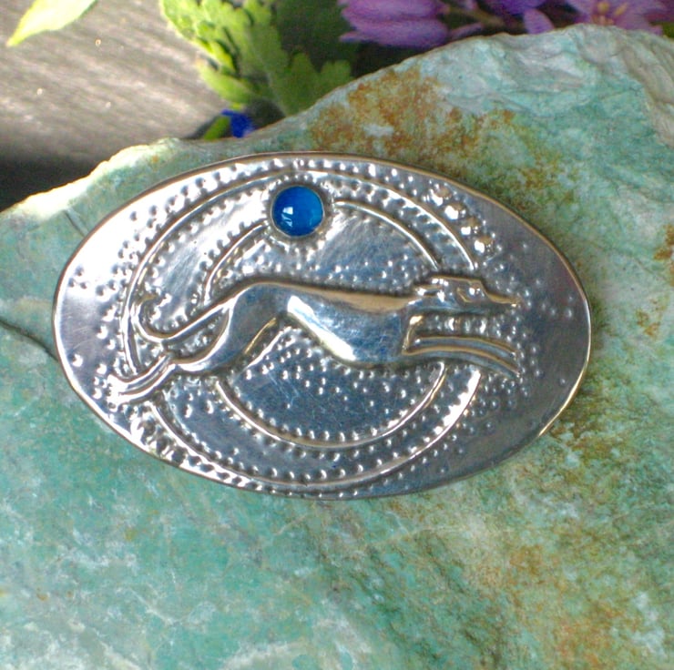 As featured in Landscape Magazine, November 2019. Embossed with a running greyhound design, this large oval brooch has been handmade in shiny silver pewter in an Art Deco style. It has been set with a genuine blue agate or onyx gemstone.