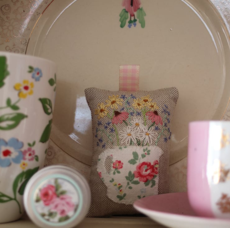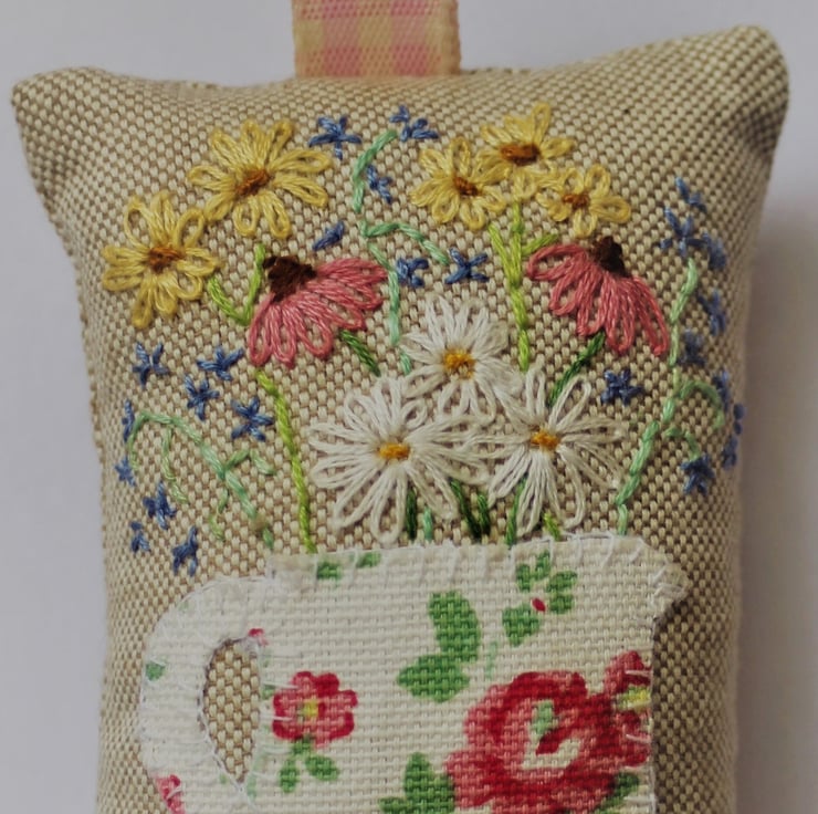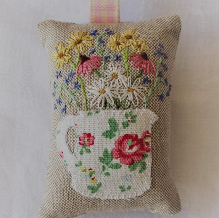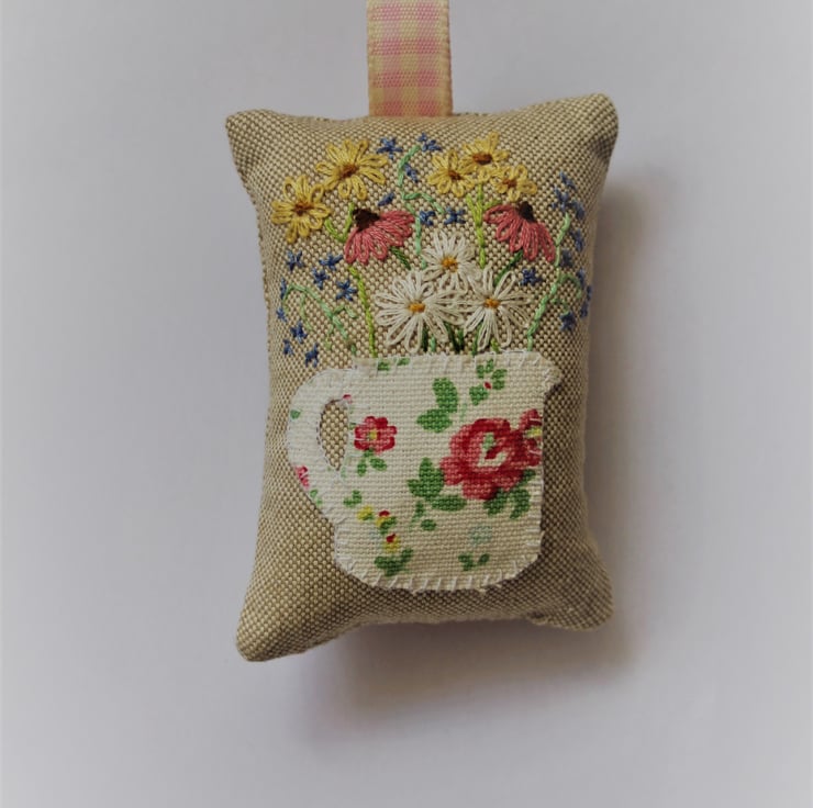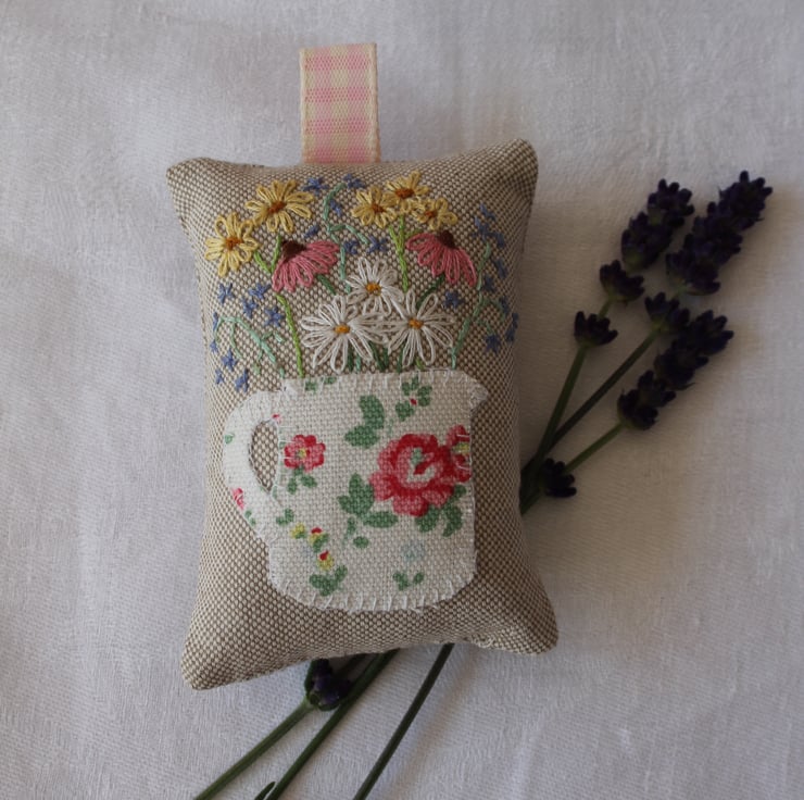 Natural linen lavender bag with a hand-appliqued jug motif hand-cut from an oddment of Cath Kidston white floral fabric. I have added hand-embroidered flowers to the design using embroidery silks. Finished with a pink and white gingham vintage style ribbon for hanging in your wardrobe, or simply pop in a drawer to fragrance your clothes. Filled with new polyester wadding and a sprinkling of English lavender picked from my own garden in Norfolk.