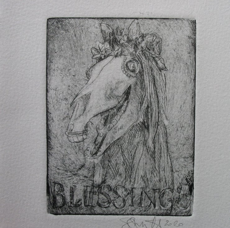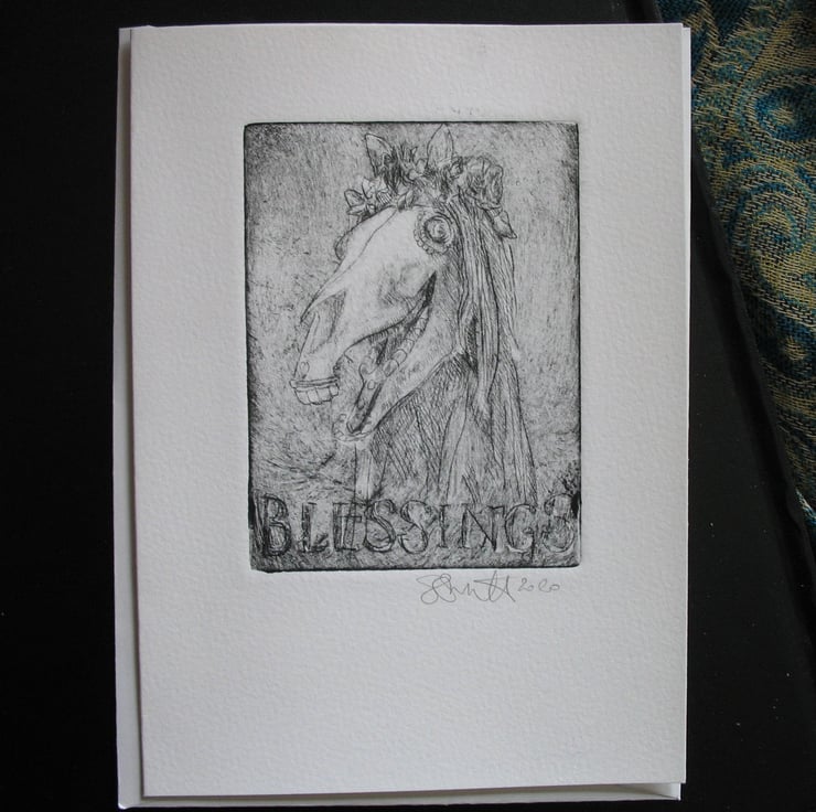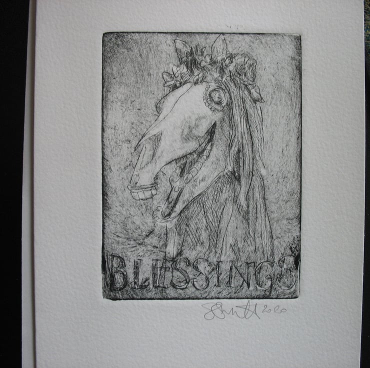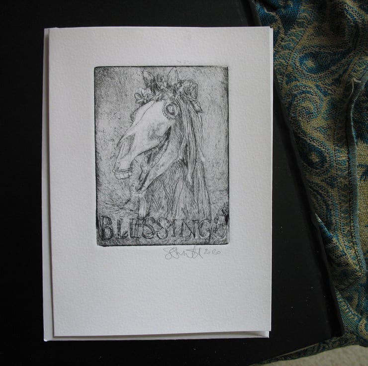 This blessings card based on the Mari Lwyd is hand printed from a plexiglass drypoint etching plate onto a Fabriano card blank using oil based etching ink.