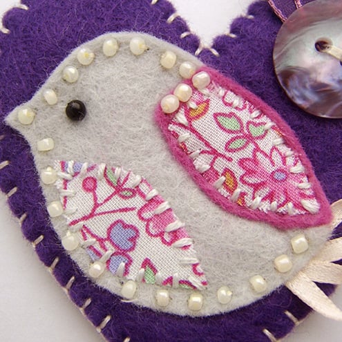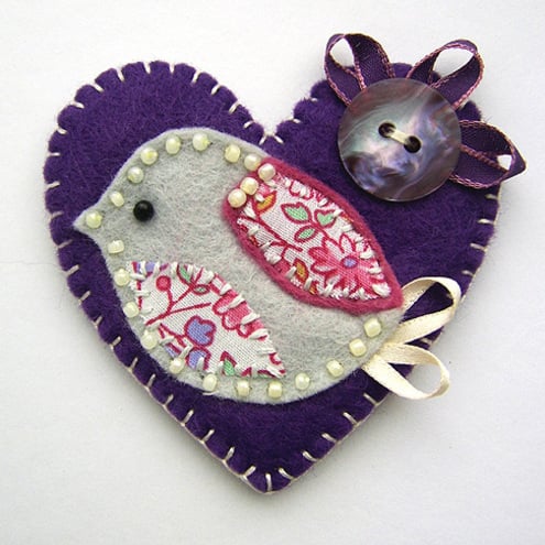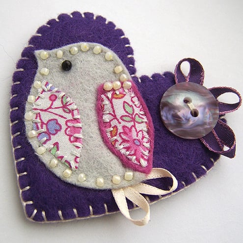 This is a lovely handmade fabric brooch. It features a sweet little bird with appliqued wing and belly. It is edged with pretty beads and mounted onto a heart shaped felt base. It is finished with a lovely button and ribbon detail and has a brooch backing for easy attachment.