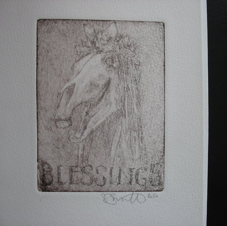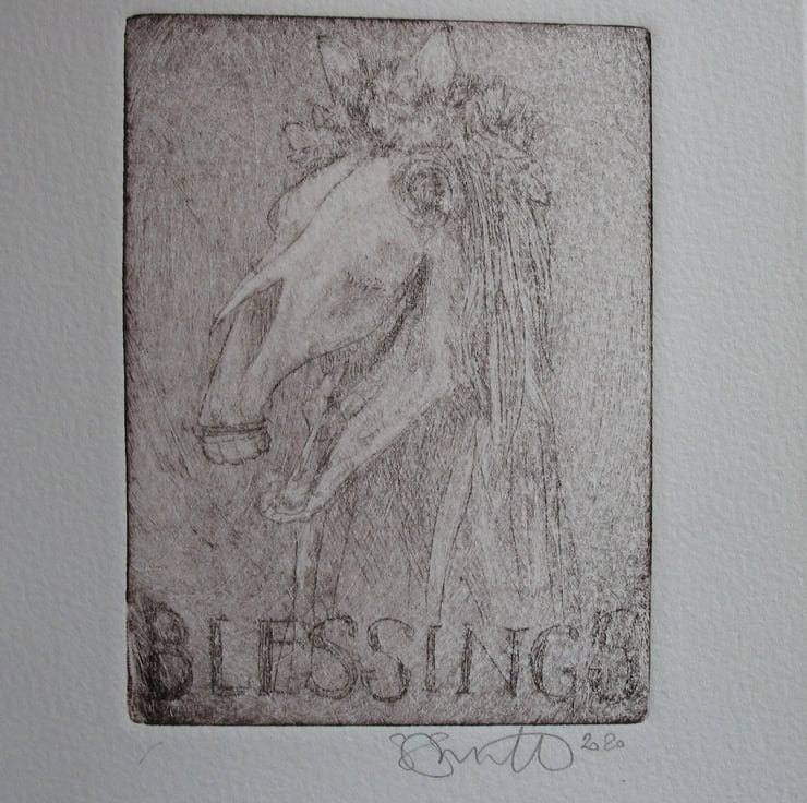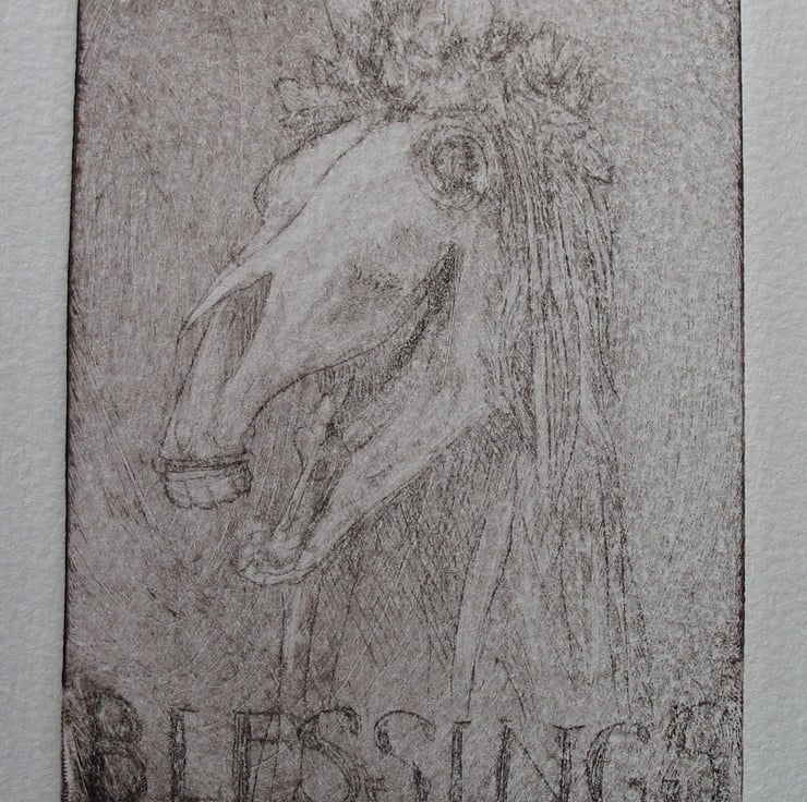 This blessings card based on the Mari Lwyd is hand printed from a plexiglass drypoint etching plate onto a Fabriano card blank using oil based etching ink.