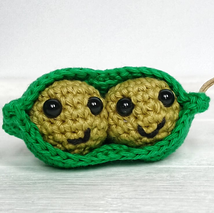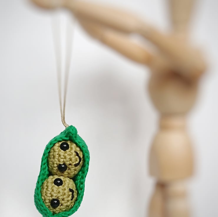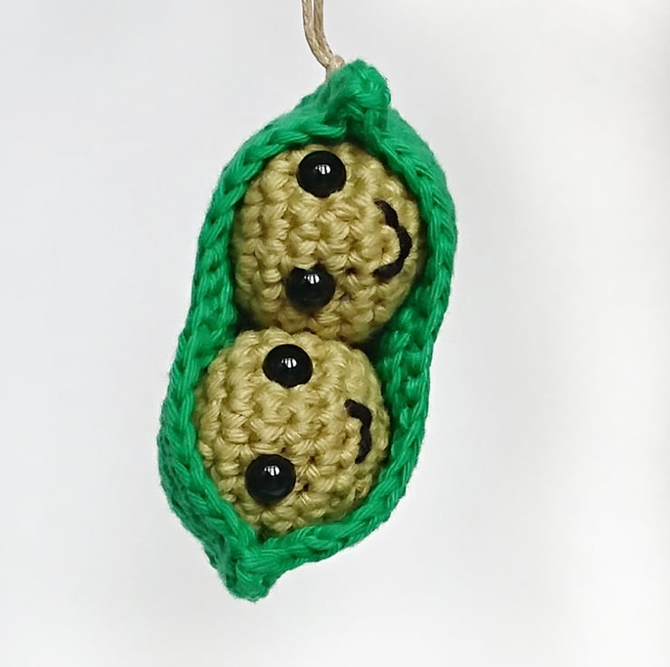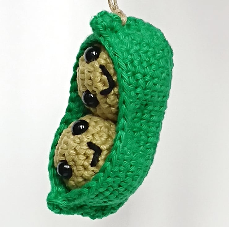 2 cute amigurumi peas in a pod, made with cotton yarn and a twine hanging loop.