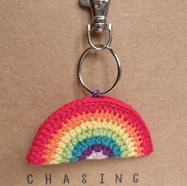 The rainbow is crocheted with Ricorumi yarn, a wonderfully vibrant cotton yarn. This is then attached with micro paracord to the key ring.