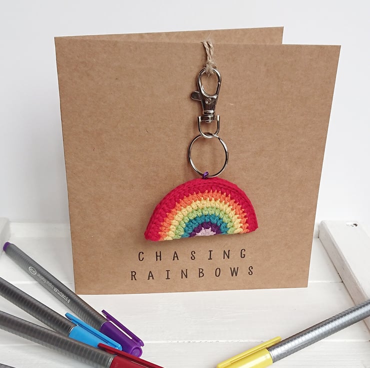 Greeting card with a detachable crochet rainbow key ring/bag charm