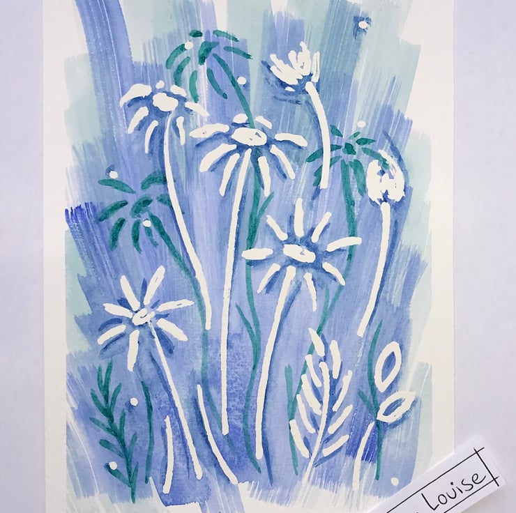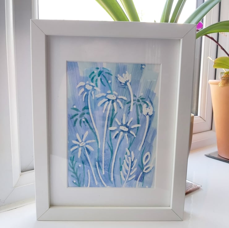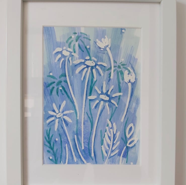 This is an A5 watercolour painting that features daisies. The background is a lovely wash of blue with shadow daisies in teal.