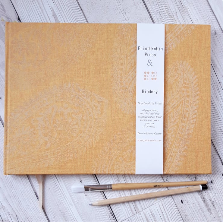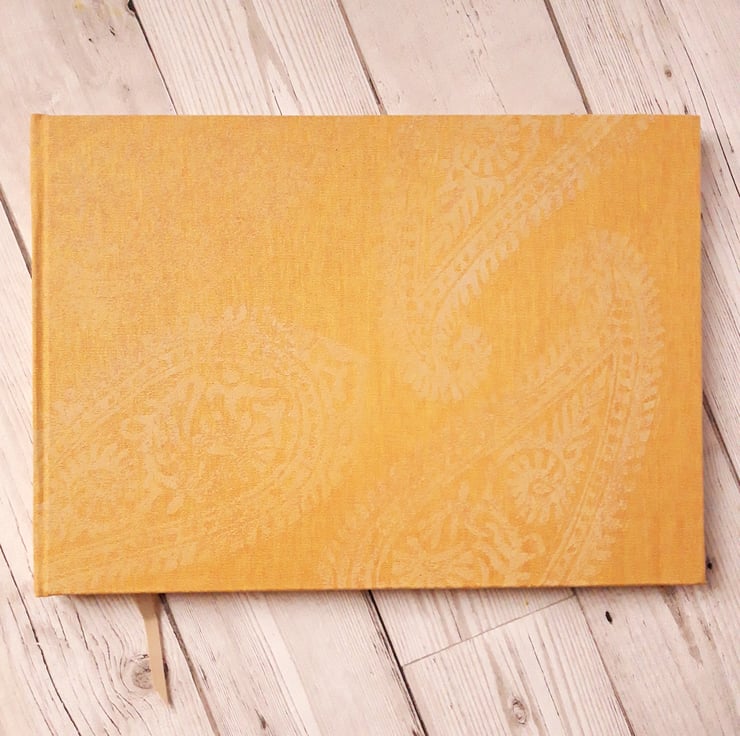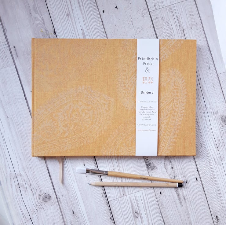 Paisley watercolour sketchbook or journal, with Cornish Linen in a popular A4 landscape format. Hand stitched & bound with Bockingford Watercolour paper 190 gsm. Smooth and soft to write on, yet strong enough for watercolour or inks. Hand cut pages throughout with silk headband detailing. Ideal also as a journal.