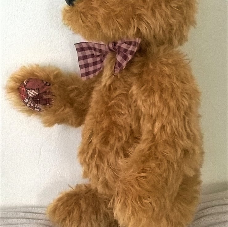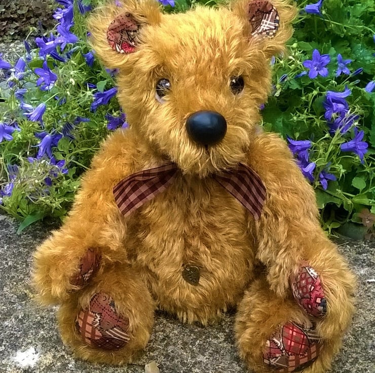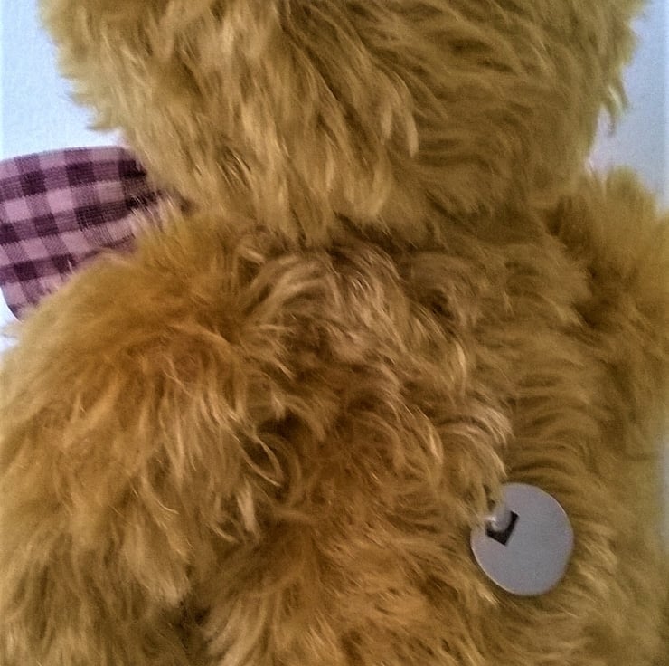 I am a unique one of a kind bear hand crafted by Karen Blake using quality mohair fabric with cotton paw pads. I have glass eyes and a hand crafted nose, which are positioned to create my unique character. Cotter joints allow me to move my head arms and legs, so as well as singing a song I can also do a little dance. As with all summertree bears, I have a small heart shaped pendant attached to my belly which reads 'hand made with love'. When sitting I am approx 8 inces or 20cm high and to complete my look I have been given a very smart bow tie.