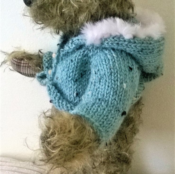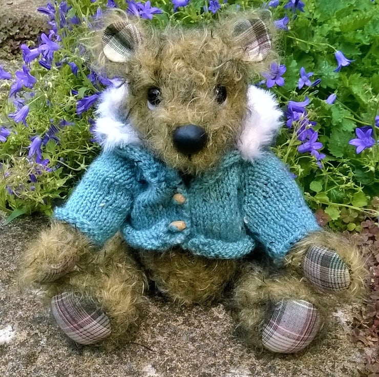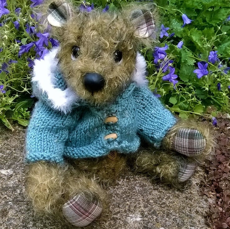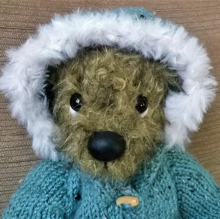 I am a unique one of a kind bear hand crafted by Karen Blake using quality mohair fabric with cotton paw pads. I have glass eyes and a hand crafted nose, which are positioned to create my unique character. Cotter joints allow me to move my head arms and legs, so as well as singing a song I can also do a little dance. As with all summertree bears, I have a small heart shaped pendant attached to my belly which reads 'hand made with love'. When sitting I am approx 8 inces or 20cm high and to keep me warm I have been given my very own hand knitted hooded jacket with fur trim.