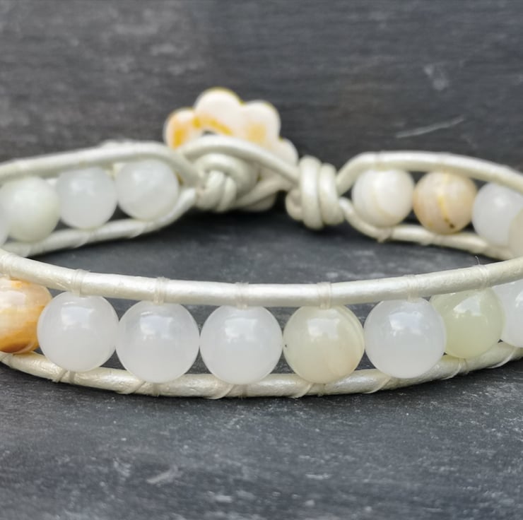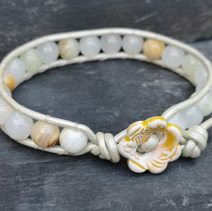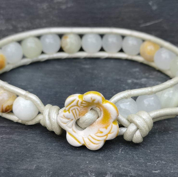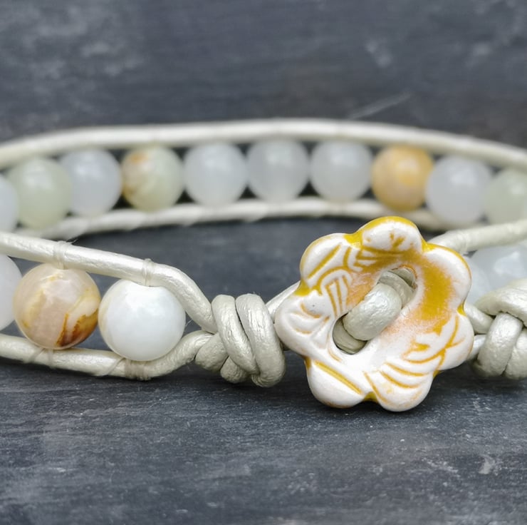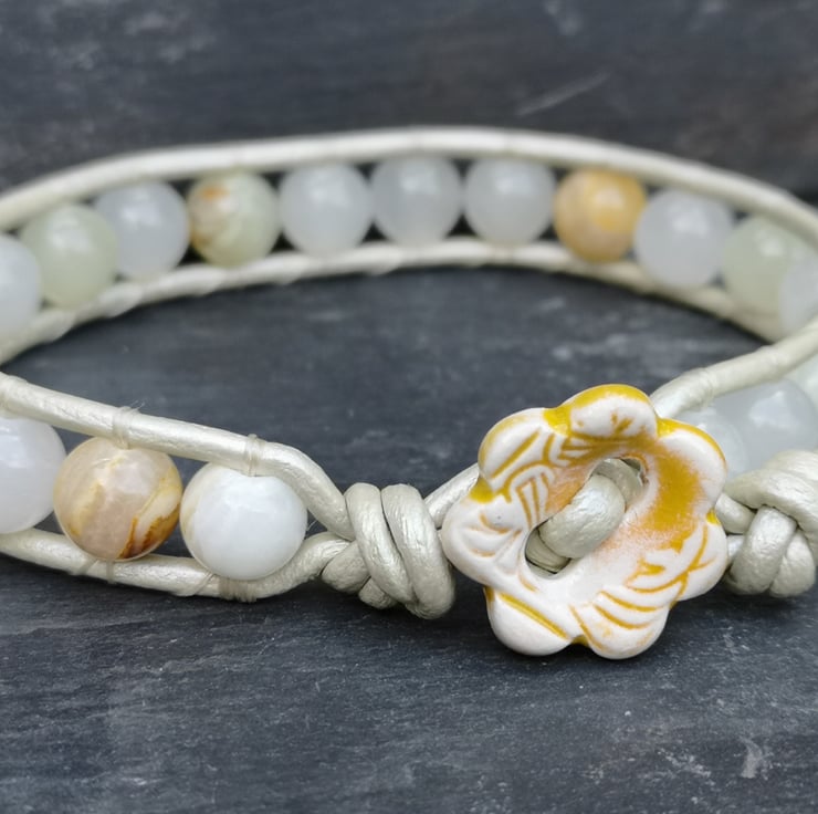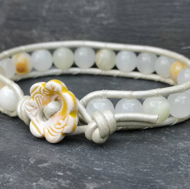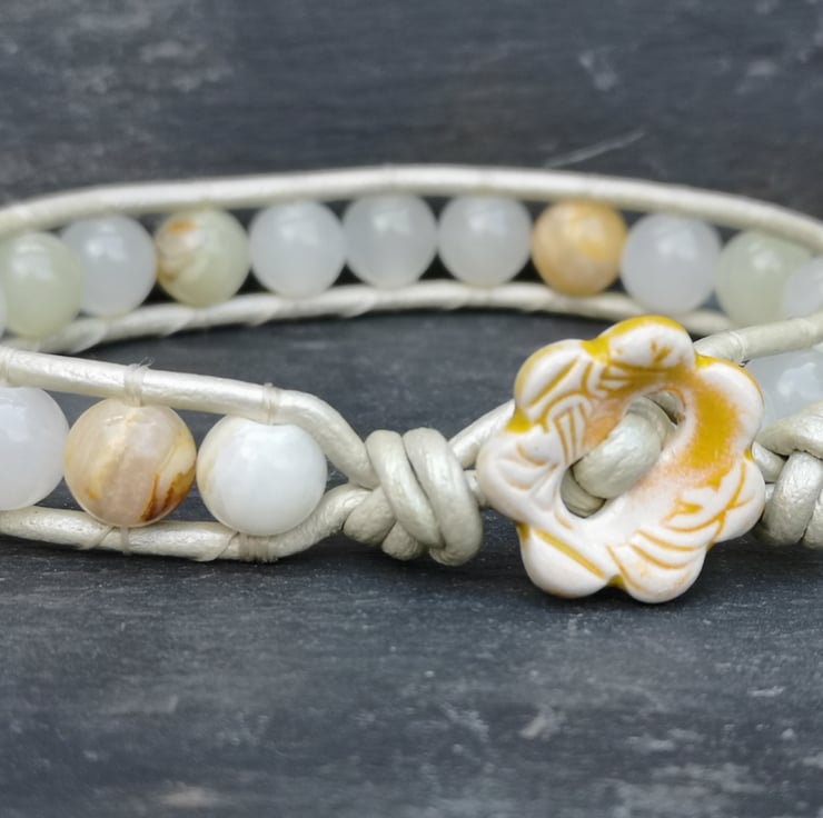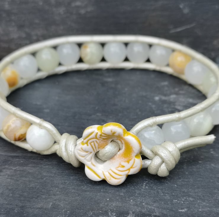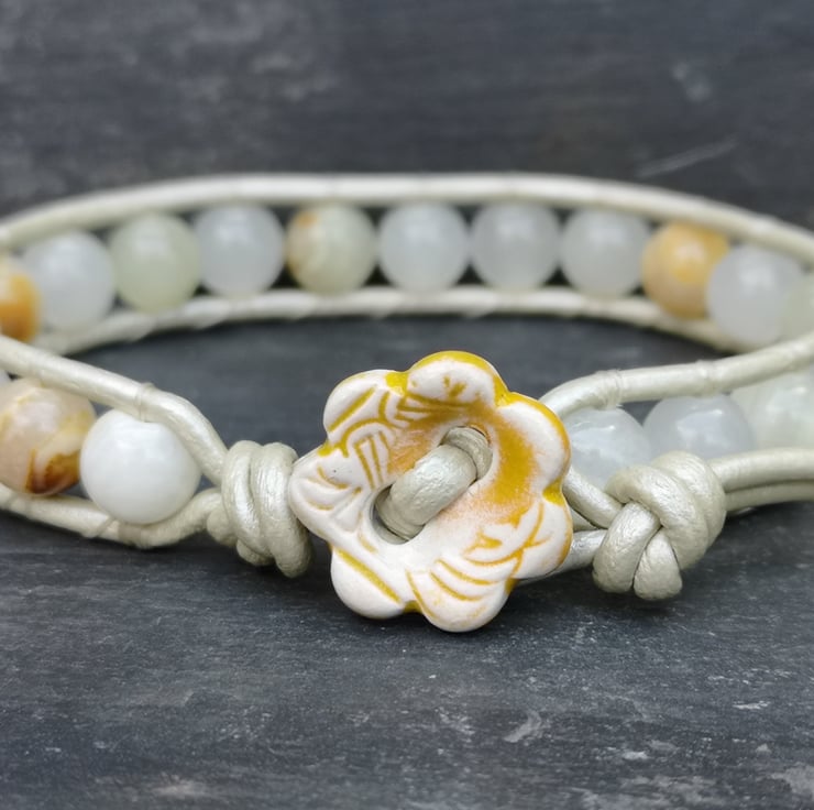 This understated bracelet has been made with metallic leather cord in a very pale gold. Beautiful semi precious Botswana jade beads have been added and a cute ceramic flower button has been used as a fastener.