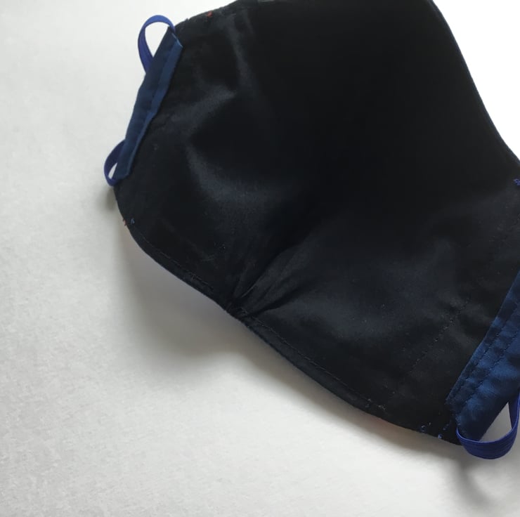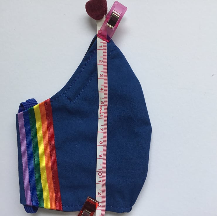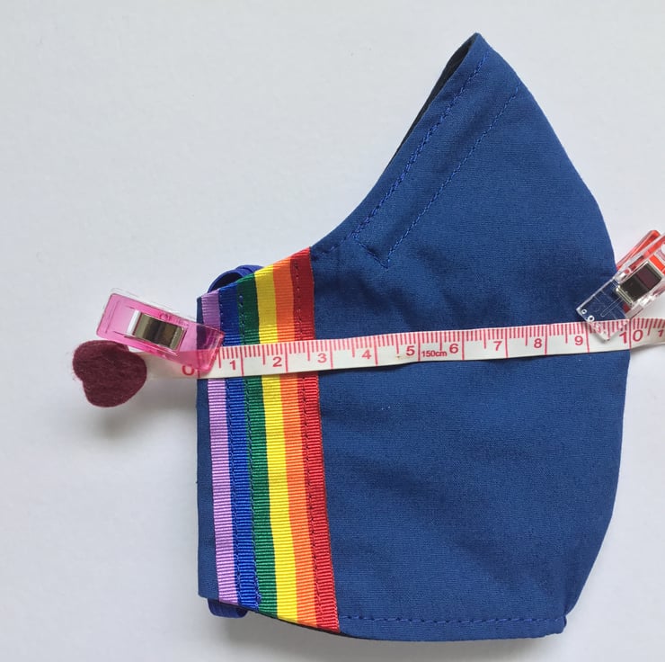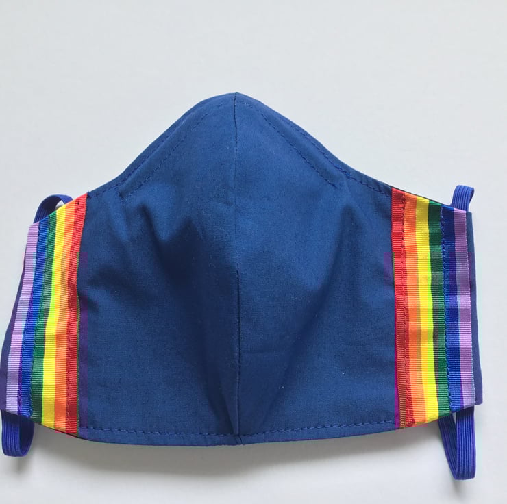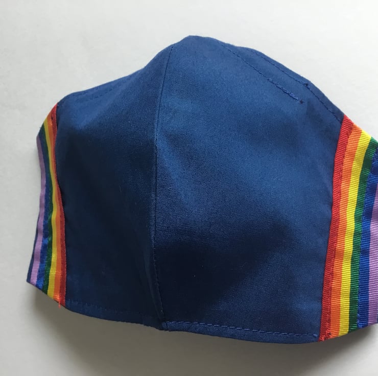 Cobalt Blue Face Covering with rainbow ribbon trim and midnight blue cotton lining. The covering has a removable nose wire which should be removed before washing and elastic ear loops to cut to size