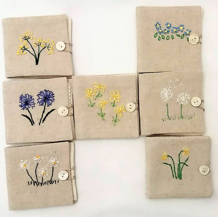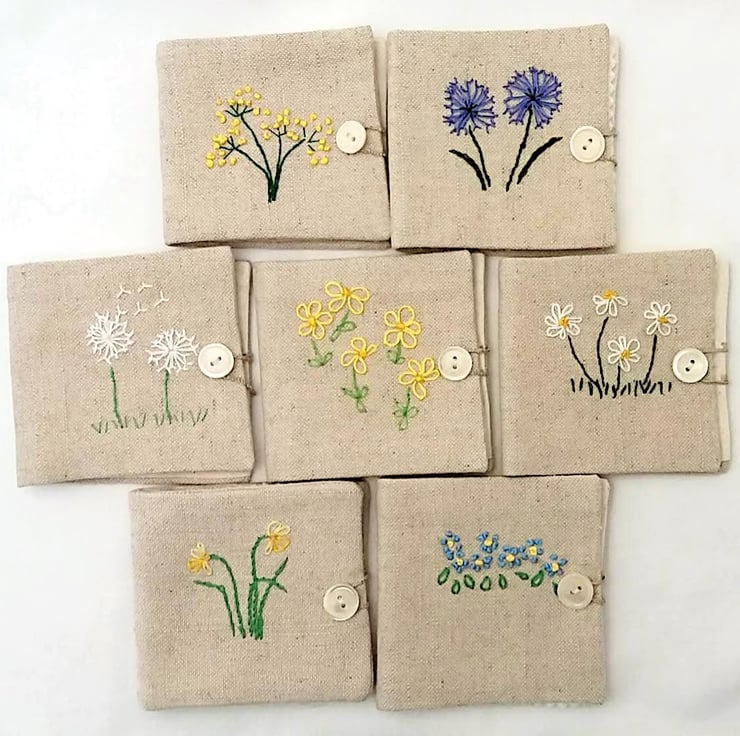 I needed a new needle book to replace one long past its best. I also had a fancy to do some flower embroidery in the style I had learnt as child. After I had made one for myself, an Agapanthus flower, I made a small range for sale.