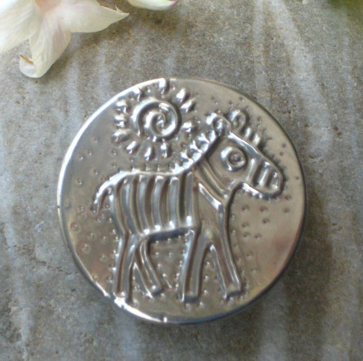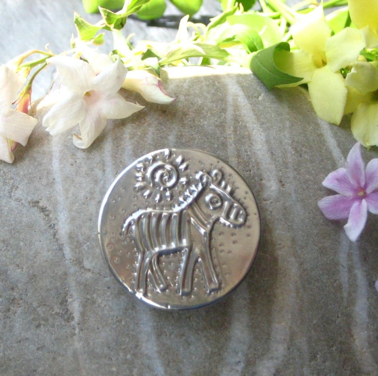 Zebra brooch or badge handmade in modern lead-free pewter. Measuring 32mm in diameter, this little brooch has a 25mm pin with safety catch on the reverse. The zebra brooch comes wrapped in tissue in an organza bag. A nice little gift for a woman for any occasion.