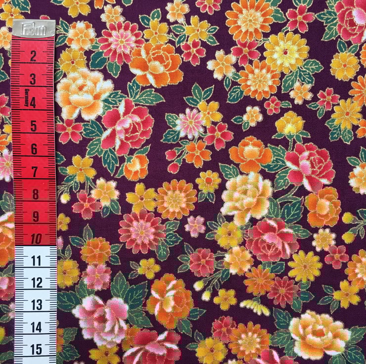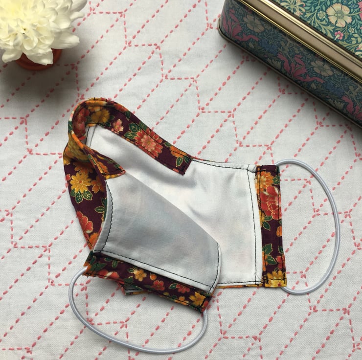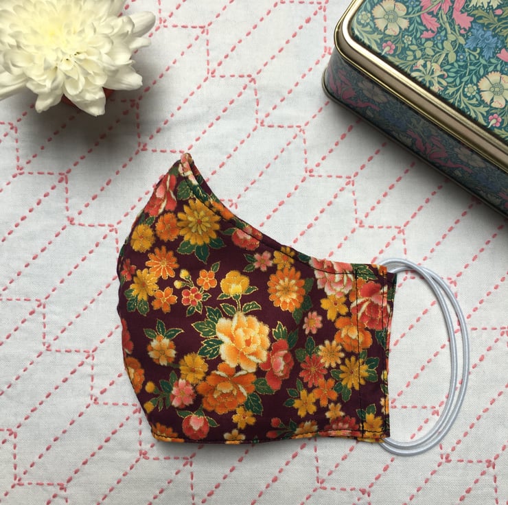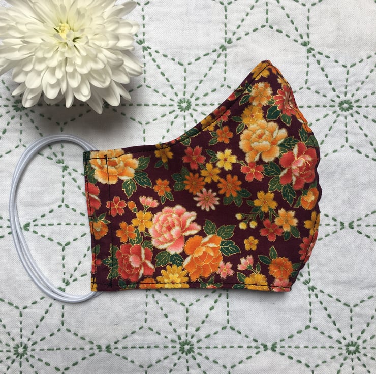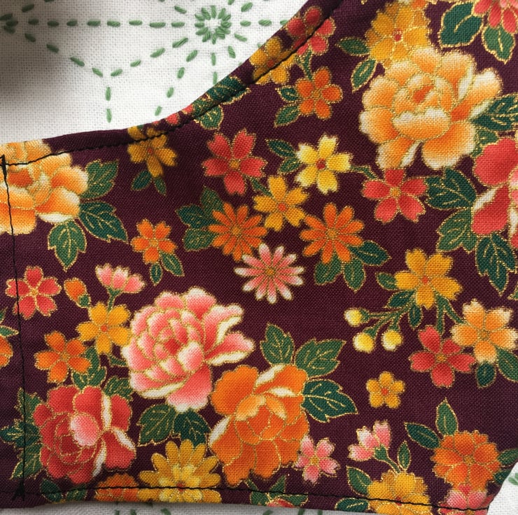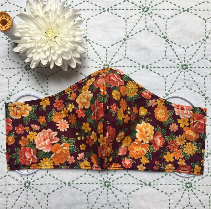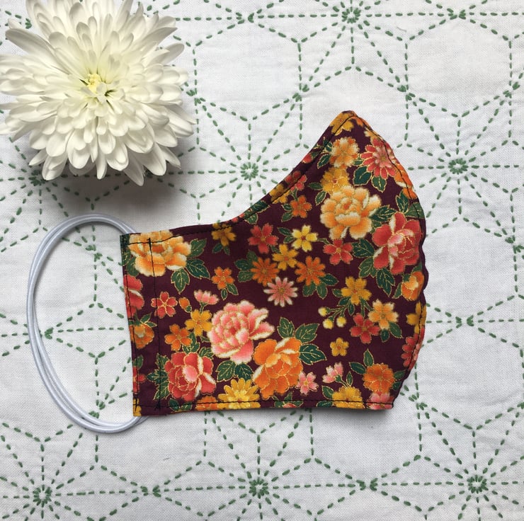 A 100% high quality purple Japanese gilded cotton fabric with orange, yellow and pink flowers. This handmade face mask has a cotton lining, is washable and reusable.