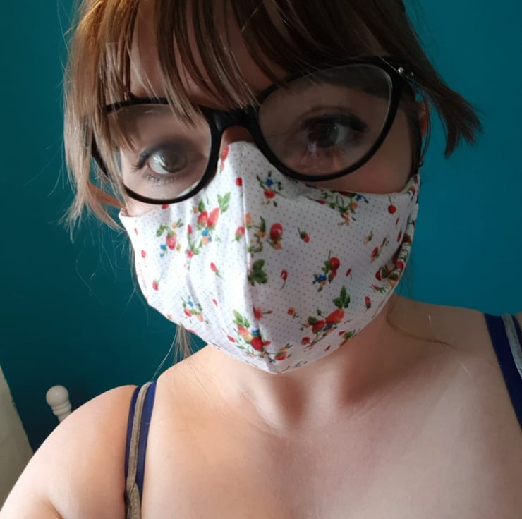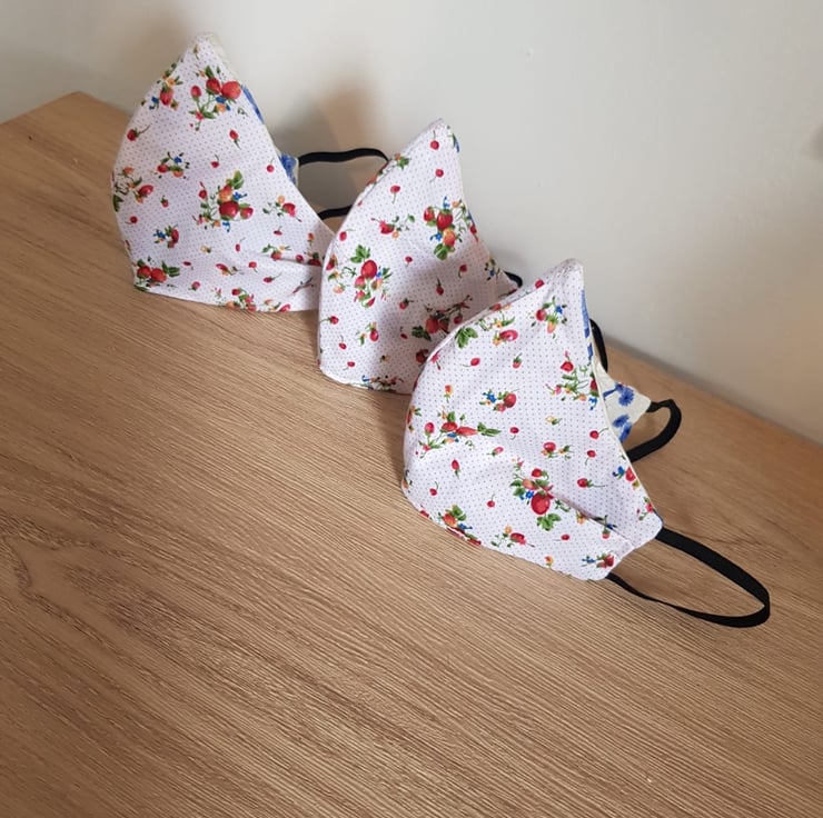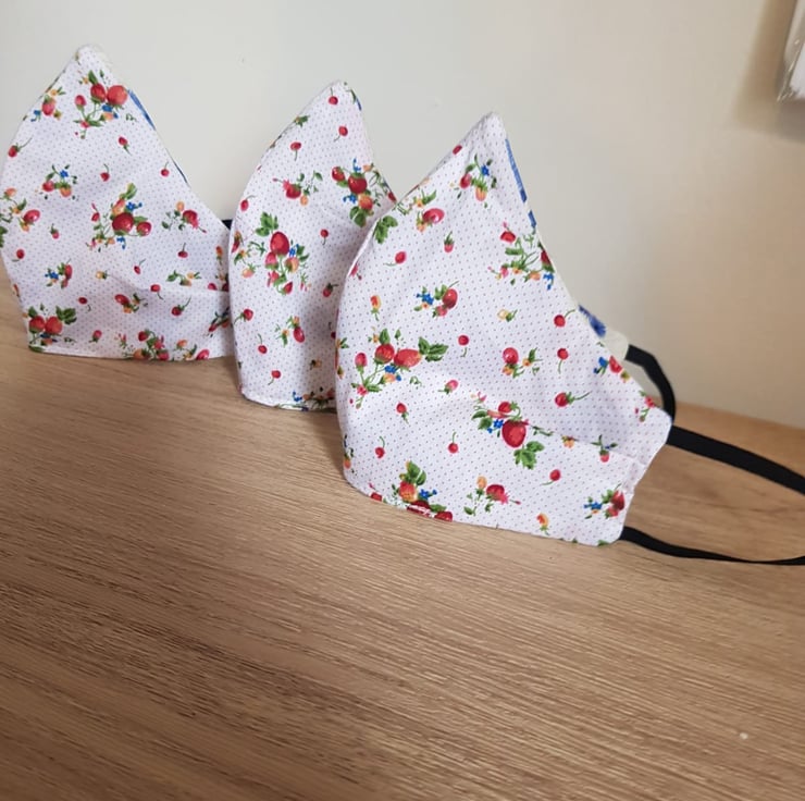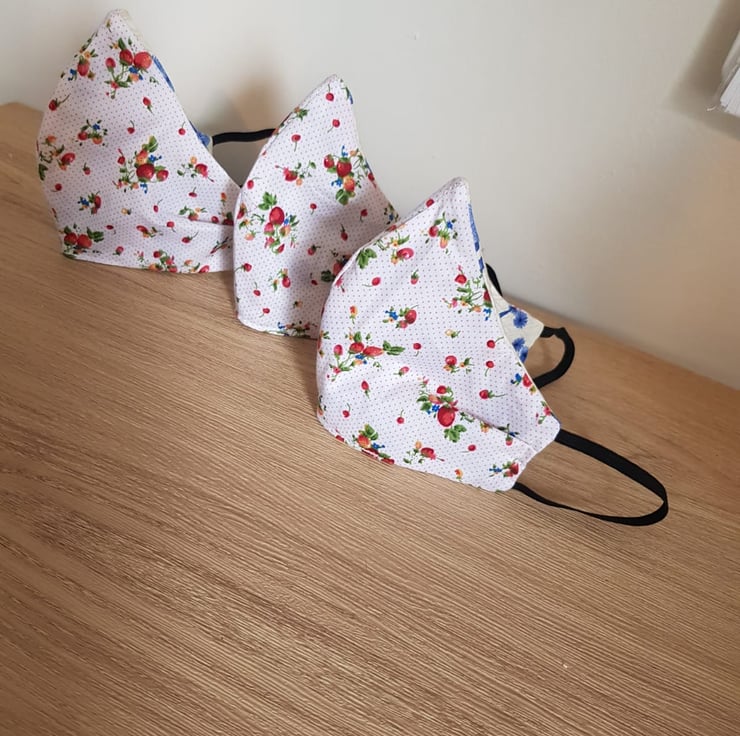 This is a handmade fabric face covering which is designed to cover the nose and mouth. They all have a small pleat on each side to help it shape around the face and a bendable cushioned wire to shape around the nose for a better fit.