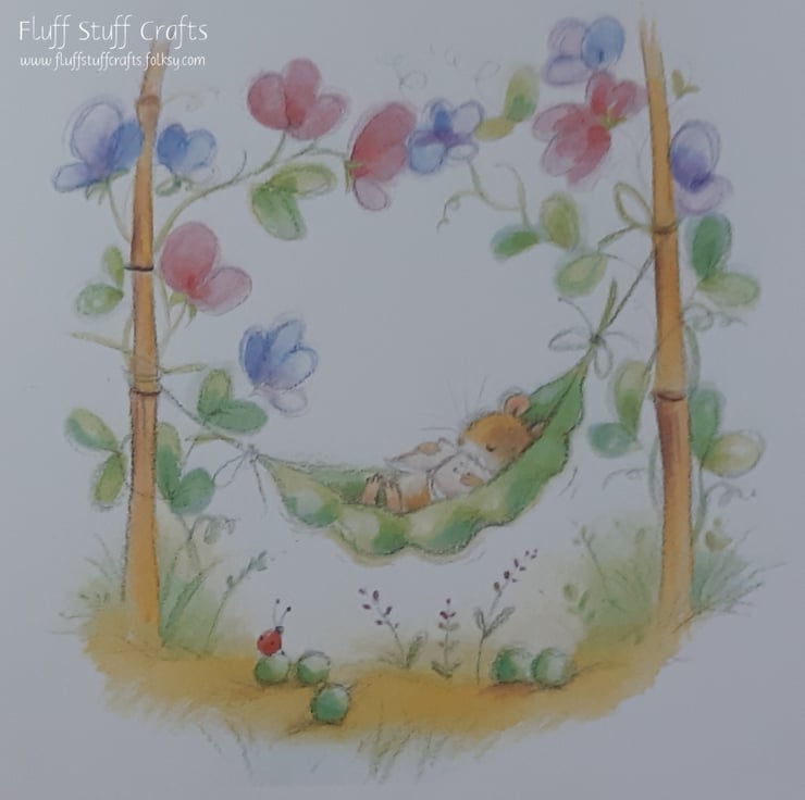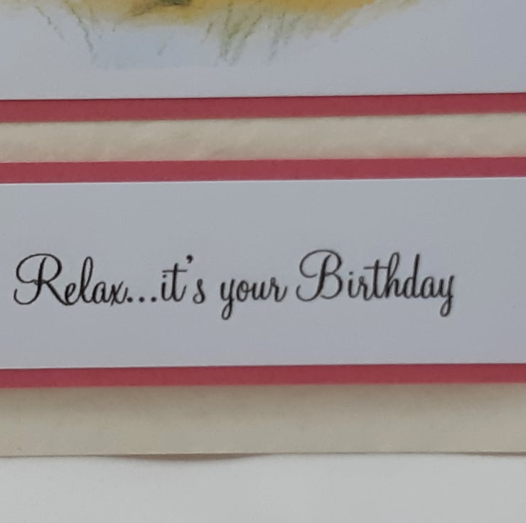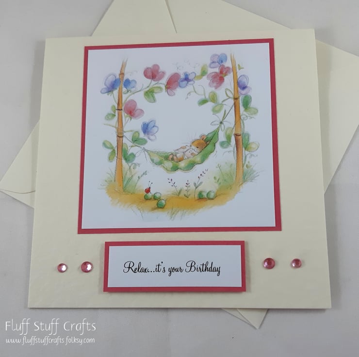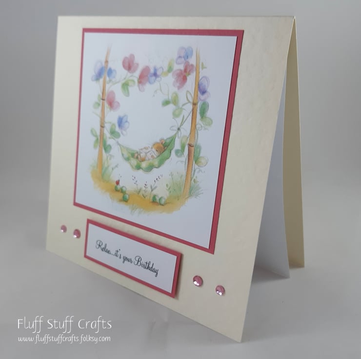 Square birthday card featuring a cute image of a mouse relaxing in a peapod hammock, surrounded by sweet pea flowers. The image has been mounted onto dark pink card, along with the sentiment 'Relax.... it's your Birthday'. The card is embellished with 4 small pink gems, 2 either side of the sentiment.