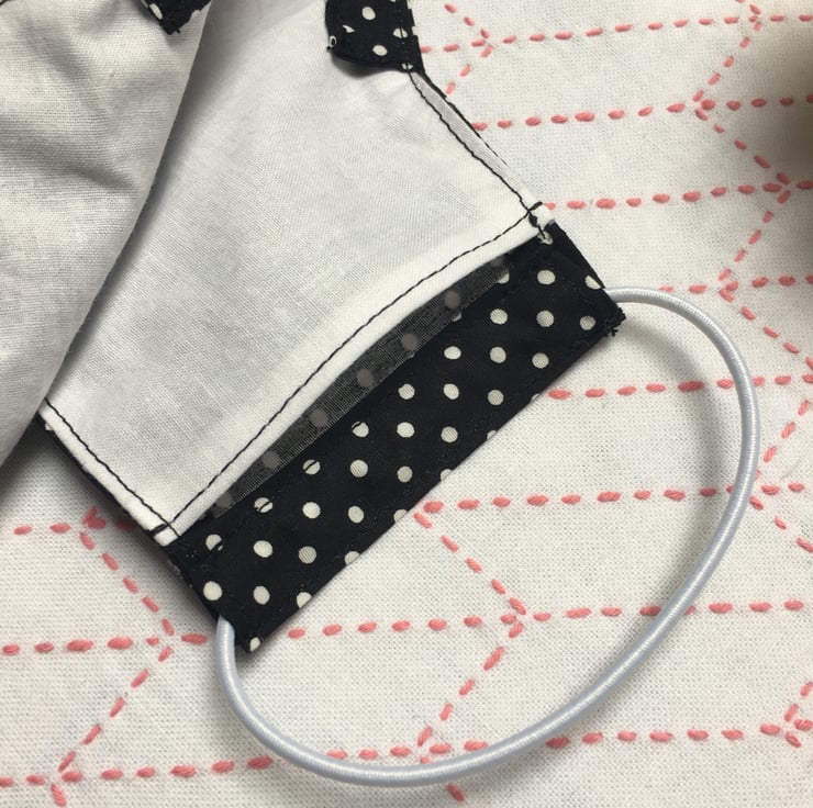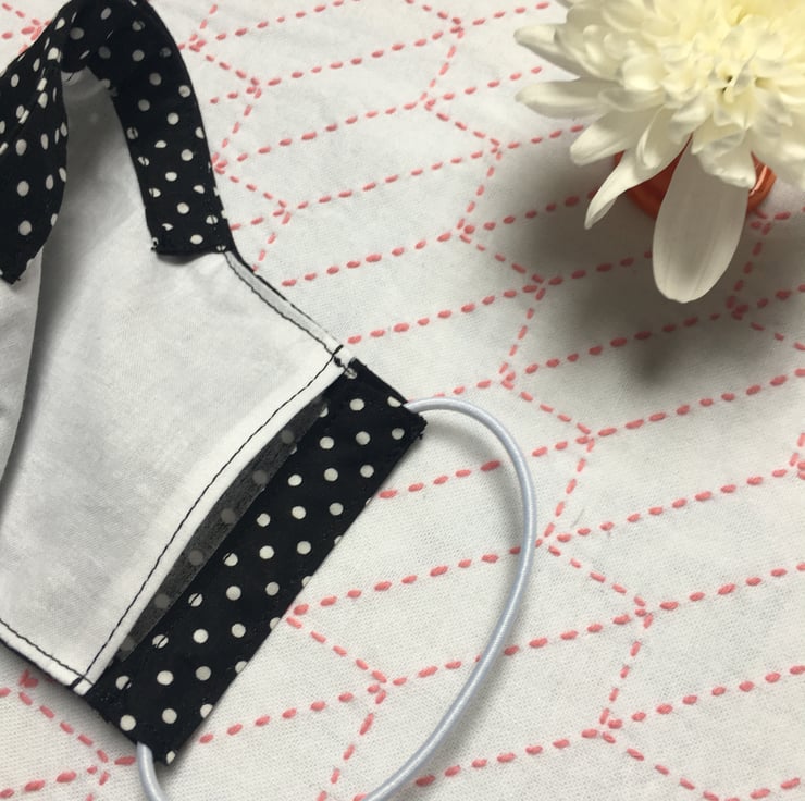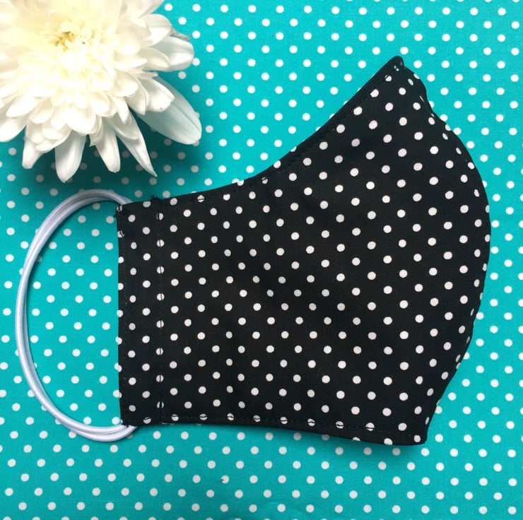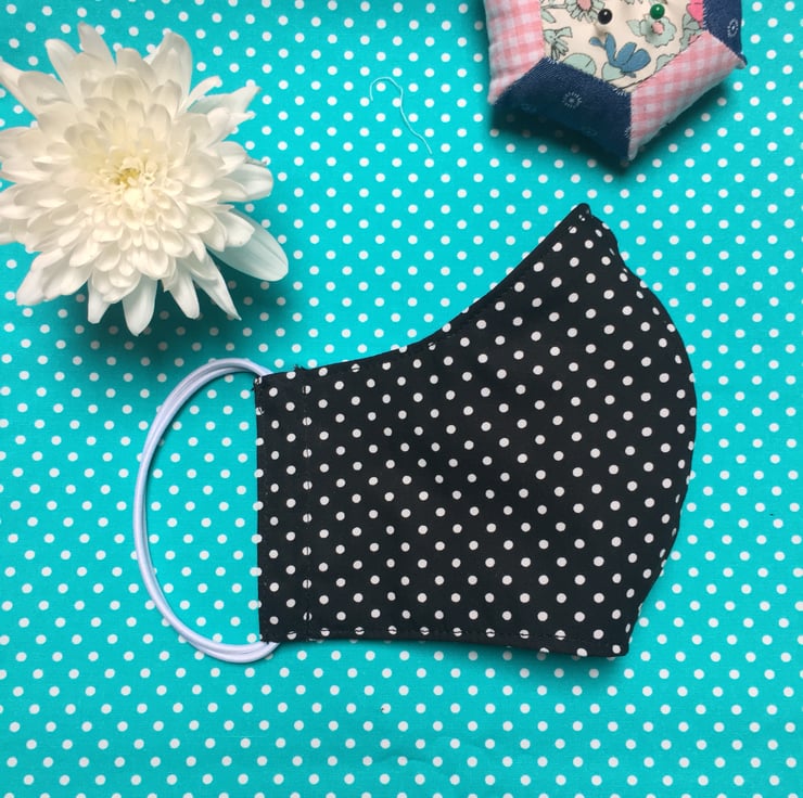 This is a 100% cotton fabric face mask, with a cotton lining. The outer fabric is a quality cotton dotted design and the lining is a high thread count soft cotton.