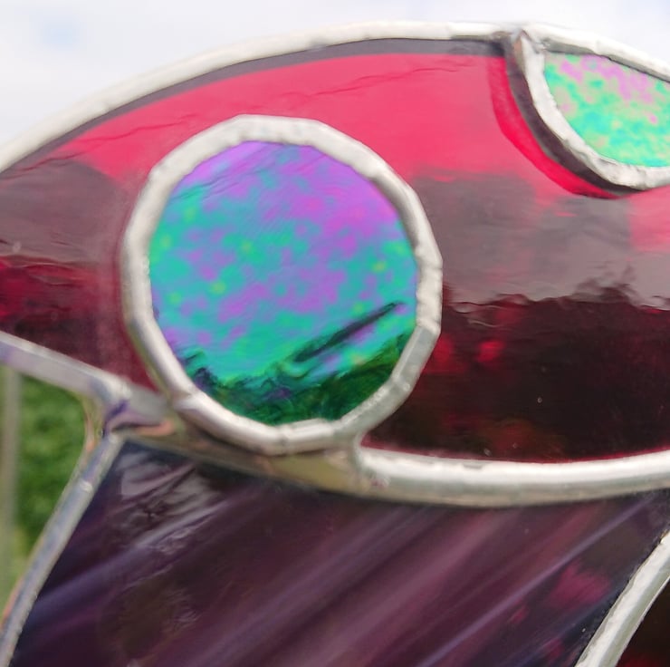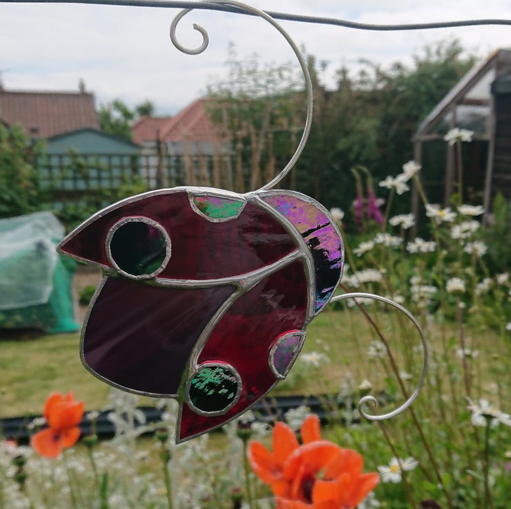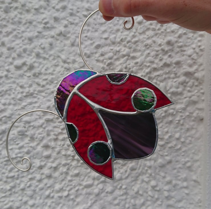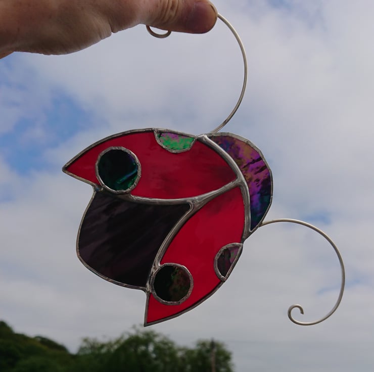 For this ladybird I have used a bright ruby red transparent water glass for the wing cases, the body is a striped maroon, the head and four spots are an opaque iridescent black which shines pink and green as the light is reflected from it.