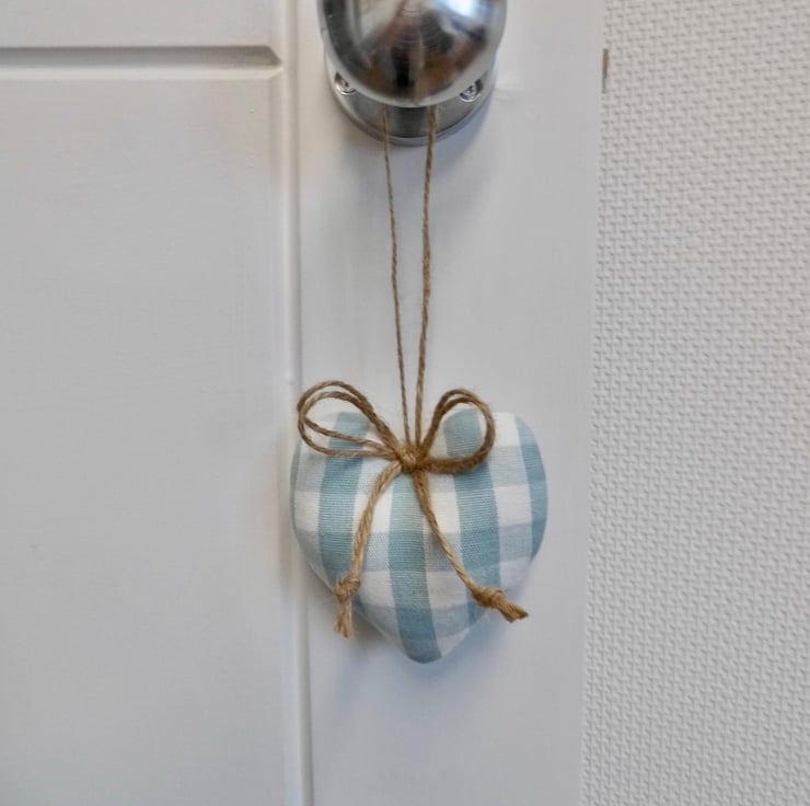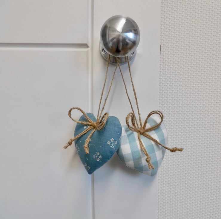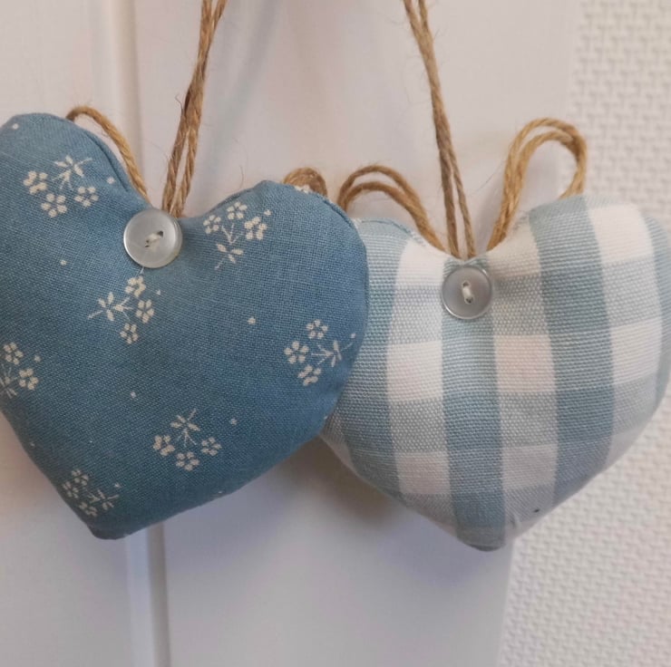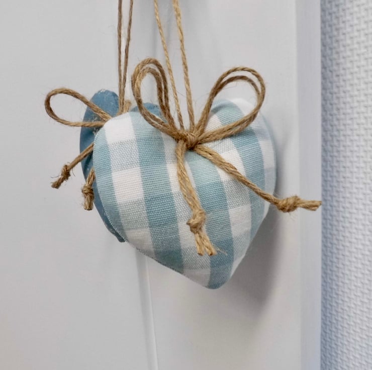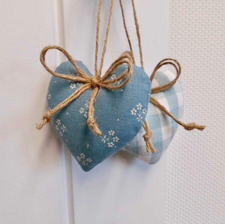 A smaller version of my popular heart decorations! Two padded heart-shaped door hangers. One is carefully made with Laura Ashley duck egg blue gingham check and the other is a vintage coordinating print, also by Laura Ashley. Hanging on a loop of natural jute twine with a double bow and finished at the back with a little button for neatness.