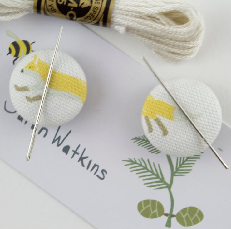 Cute as a button these needle minders are handmade from our illustrated fabrics. These pretty little fabric covered magnets match all our other items and look amazing with our embroidery kits and other craft essentials. This needle minder is a 2 pack and features a fox front and back, the fox features on our fabric available in embroidery kits. They have a strong magnet and keep your needle safe when crafting, no more hunting around for lost needles.