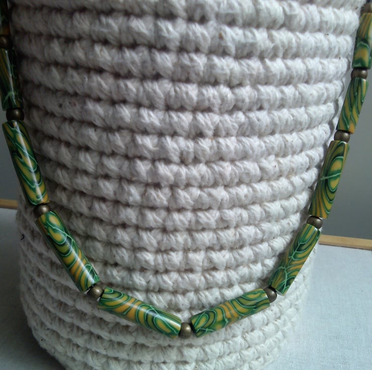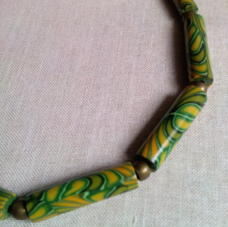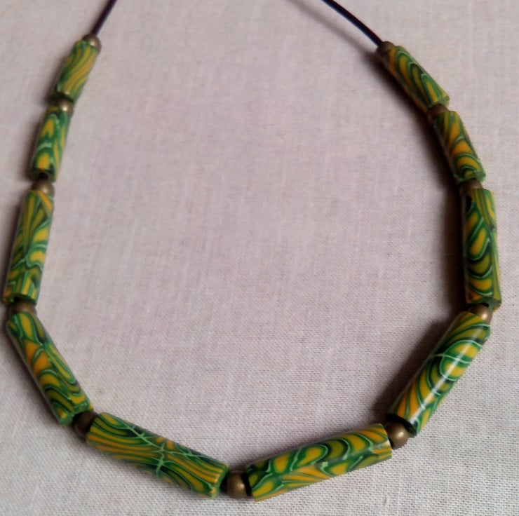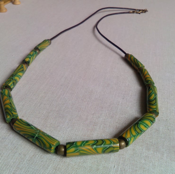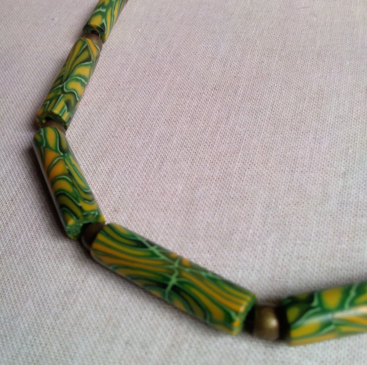 Tube bead necklace handmade by me from Polymer Fimo clay using Millefiori techniques.