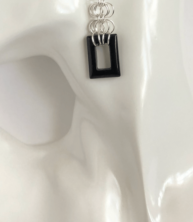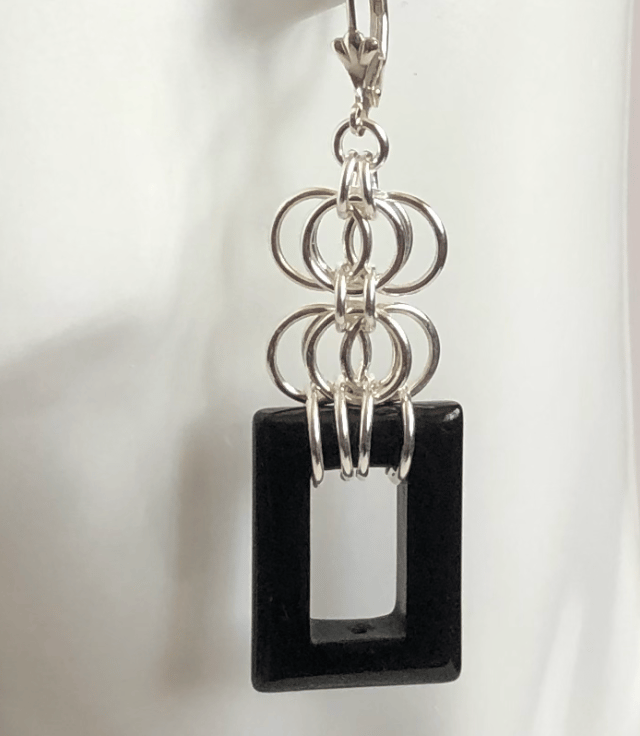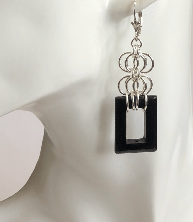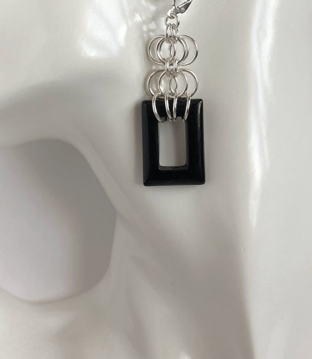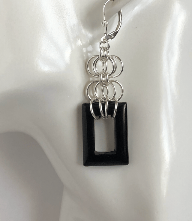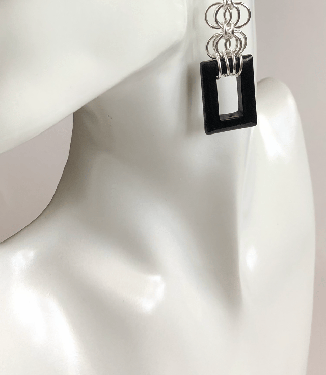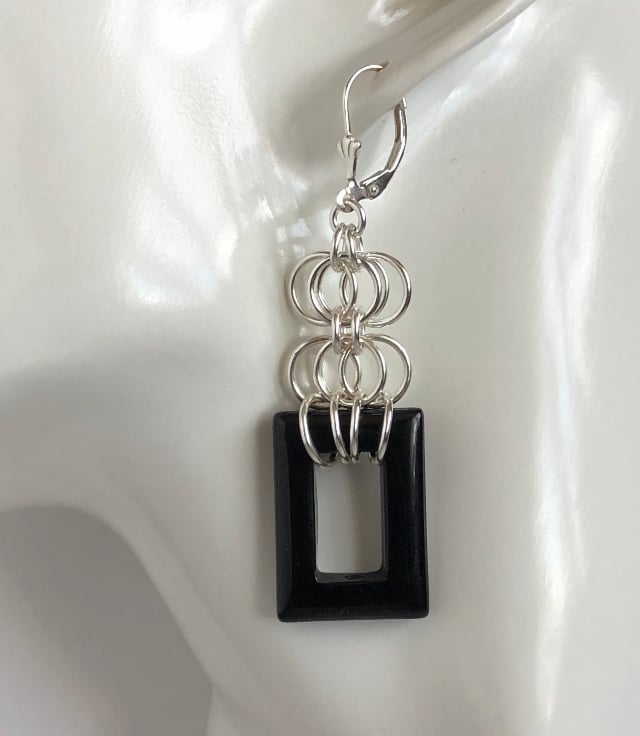 These stunning earrings have been handmade by incorporating Black Agate Rectangles with Chainmaille.