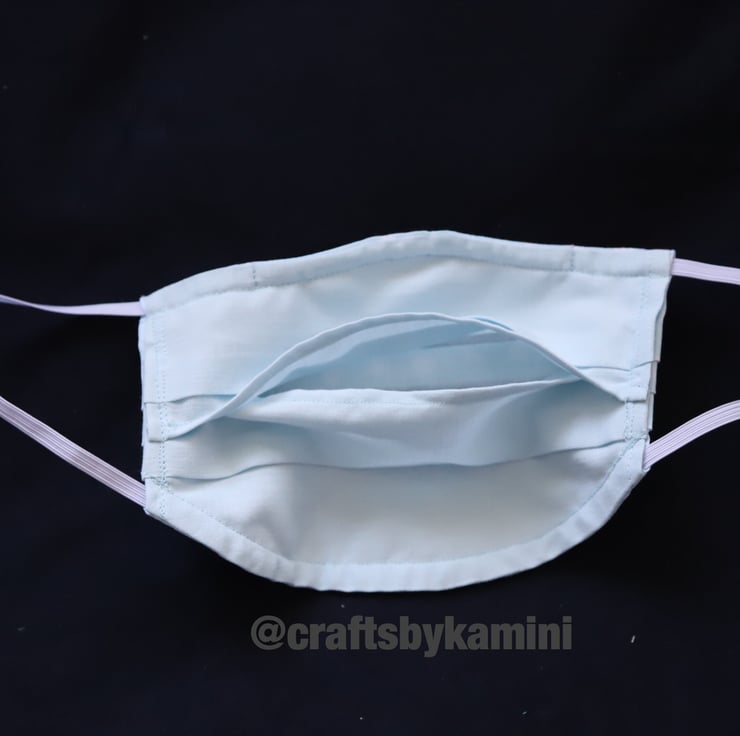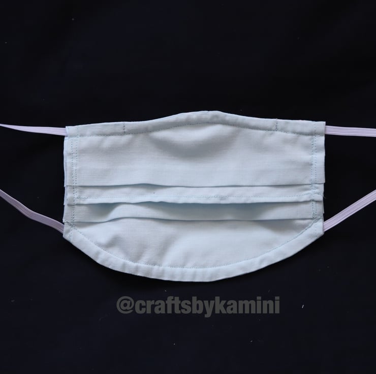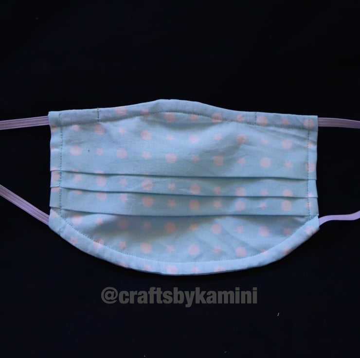 This face covering is made from 100% cotton spot and star patterned very light blue fabric (lighter than pictured), with a blue back.