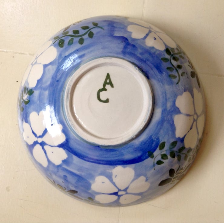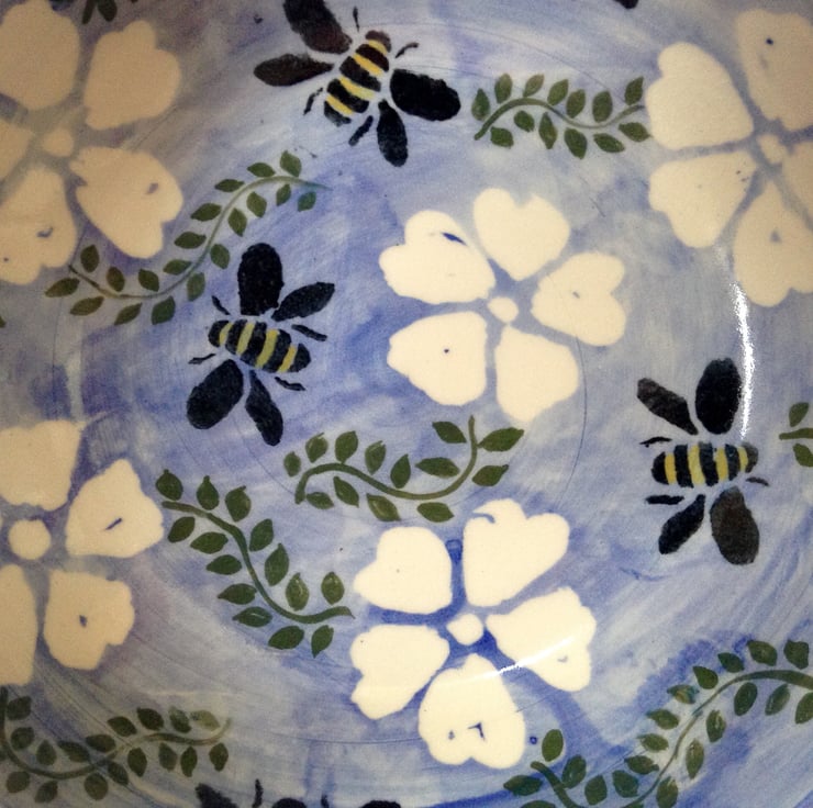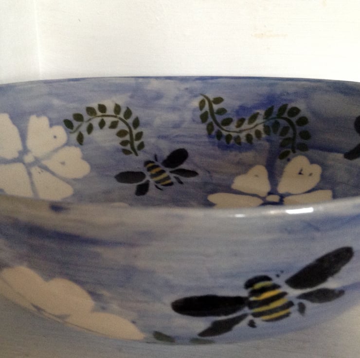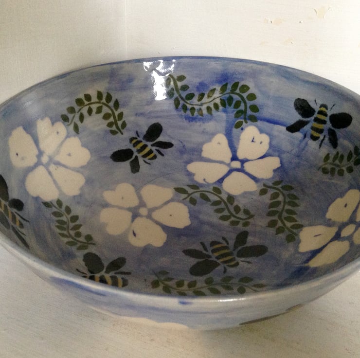 Beautiful pale blue stoneware bowl with flowers and bees decoration. The bowl is handthrown on the wheel and the decoration hand painted in blue, black, yellow and green underglaze colours. It is great for fruit or as a display piece. It measures 6.5 cms high and is 22 cms across. It is made from high fired stoneware clay and is dishwasher and microwave safe.