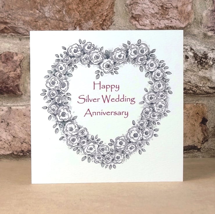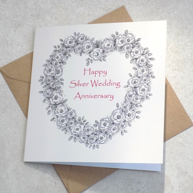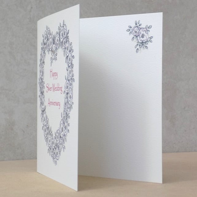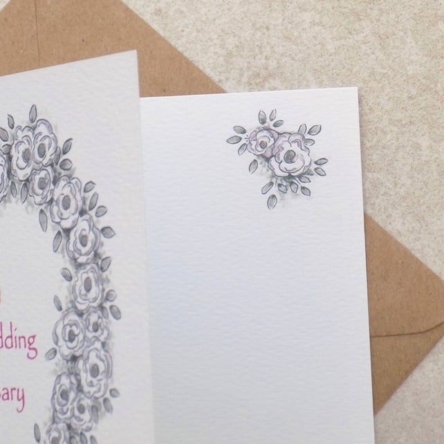 It has been printed with my own original rose artwork and has been left blank inside for your own special Anniversary message. It has been embellished with a small silver diamante as shown in the photograph above.