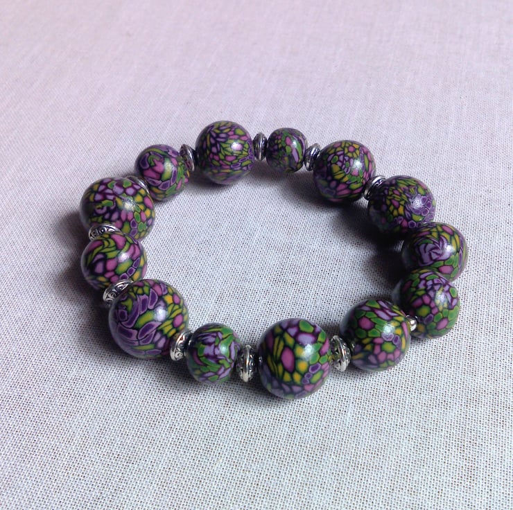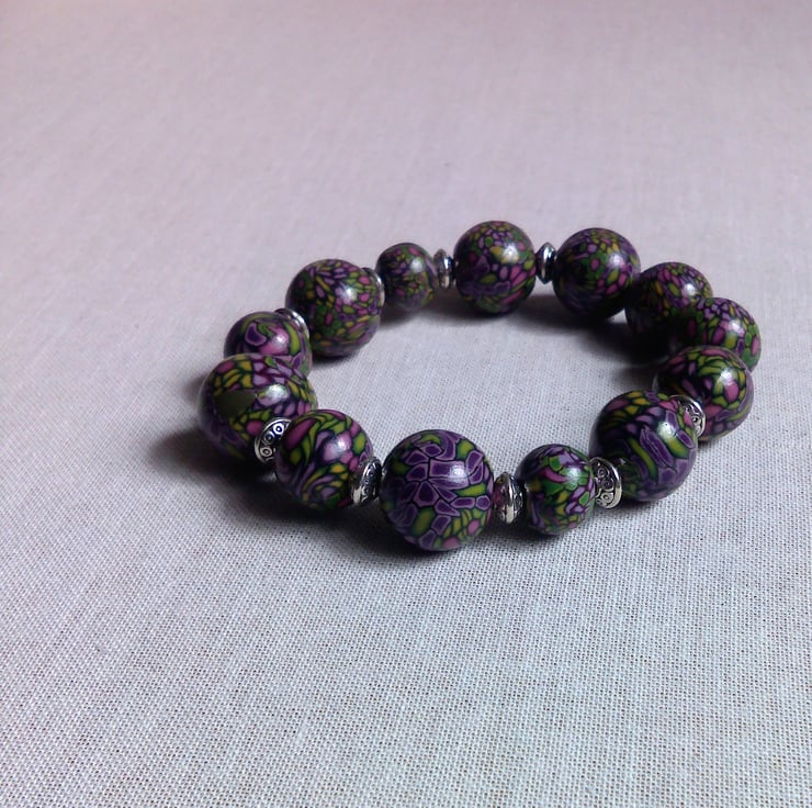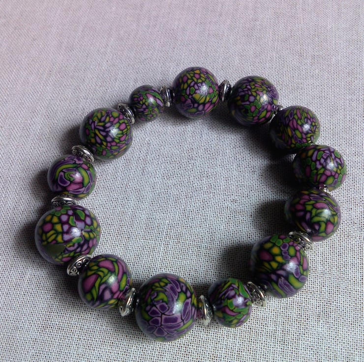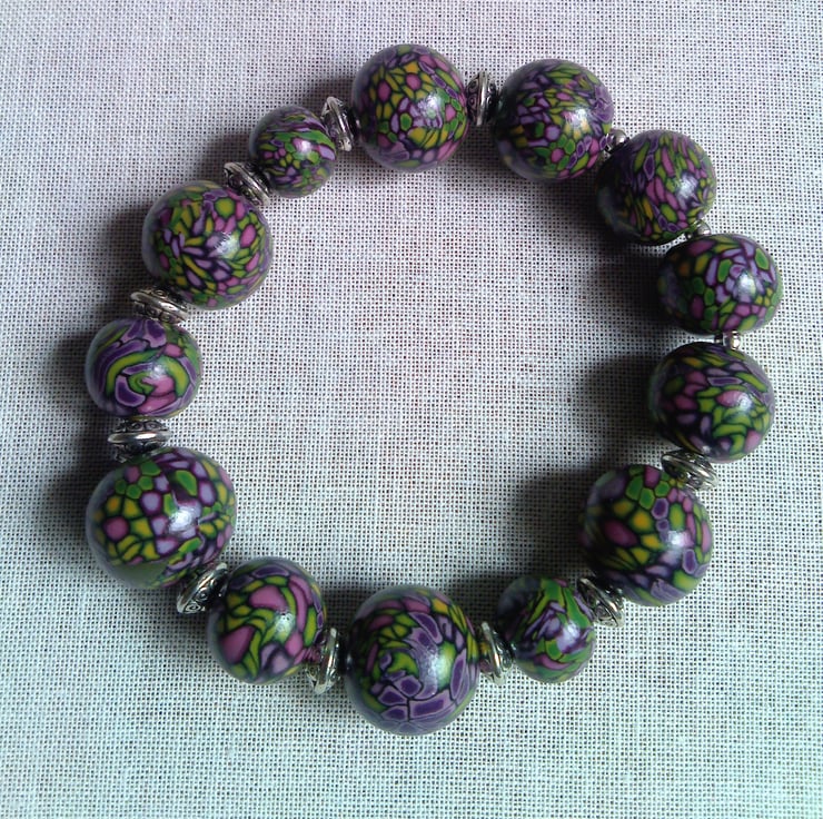 Bead bracelet handmade by me from Polymer Fimo clay using Millefiori techniques.