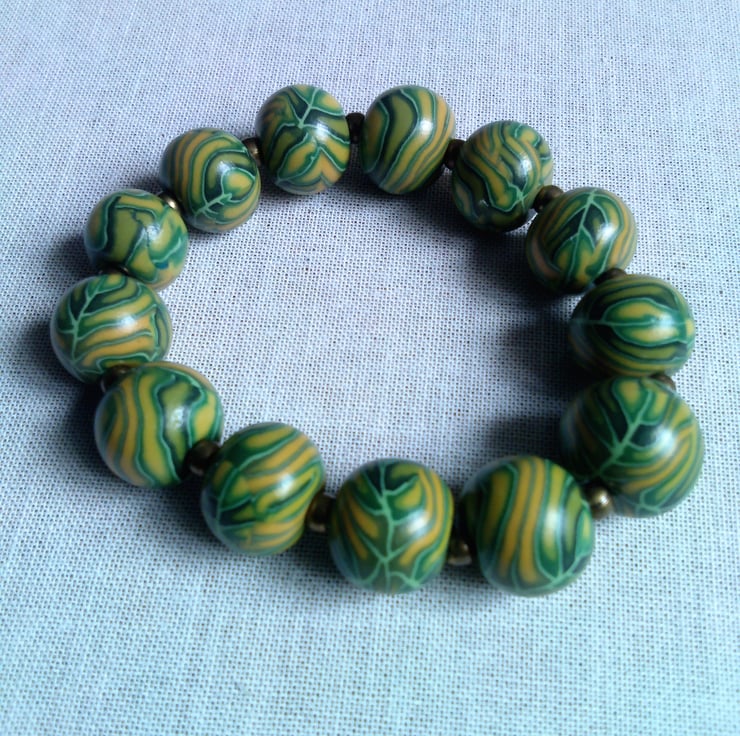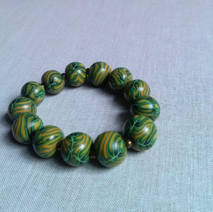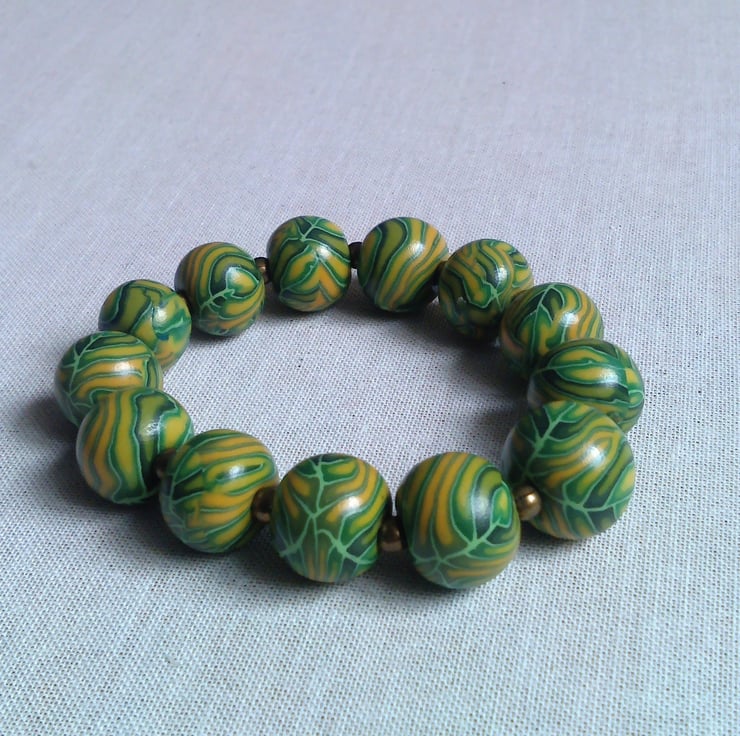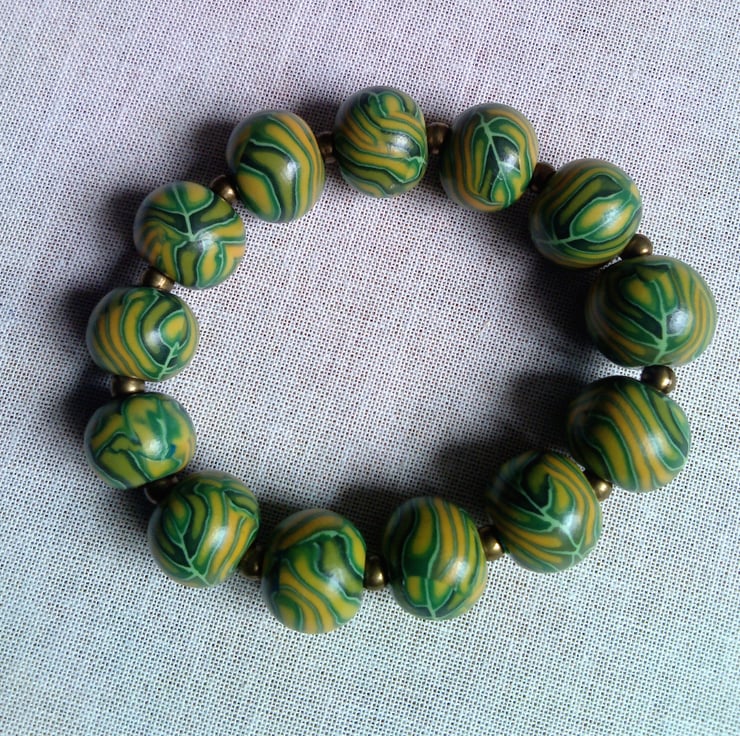 Bead bracelet handmade by me from Polymer Fimo clay using Millefiori techniques.