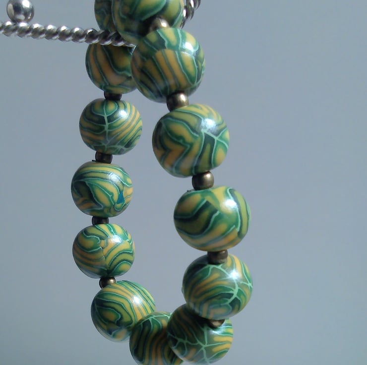 Beads rolled by hands and baked in the oven. I used thin coat of vanish to enhance colours and give them light sheen.
