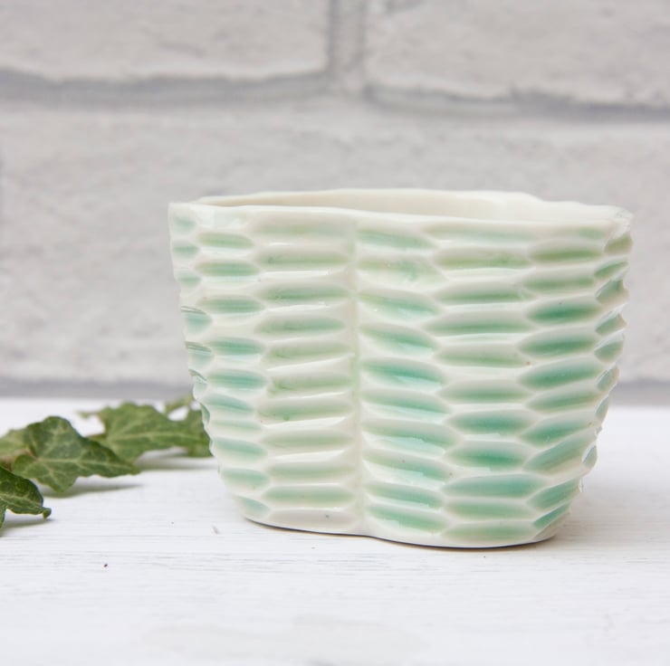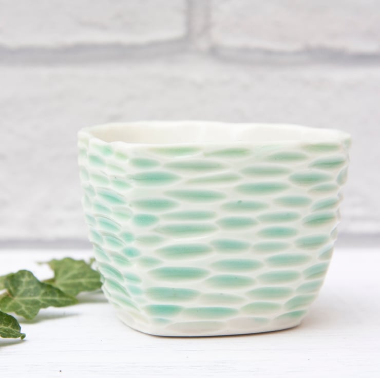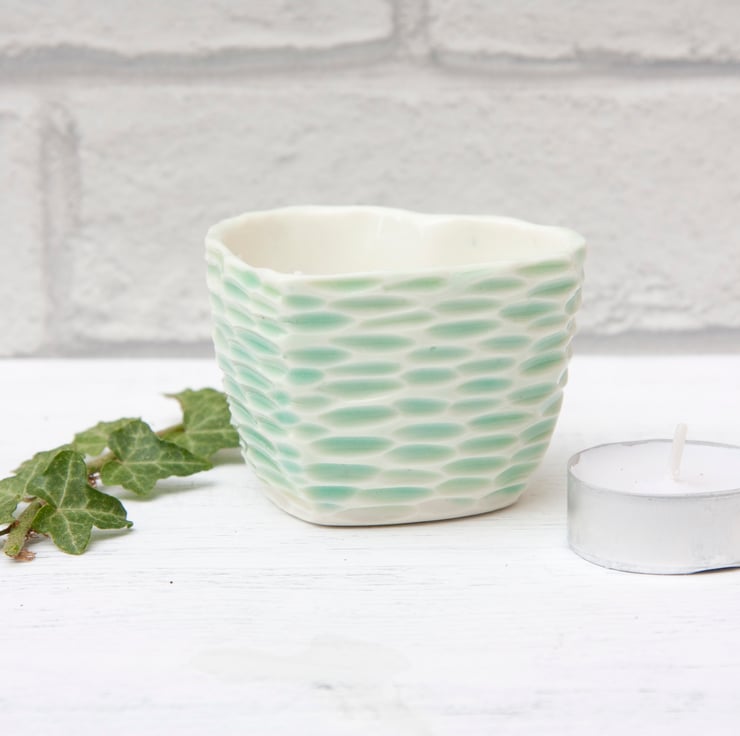 I love to make small things. I also am fascinated with texture and the tactile nature of ceramics. I work with porcelain, and when I was carving my vases, I noticed you could see the light through the carvings. I have made these tealight holders to add to any home, and they allow the light to shine through the carvings, as you can see from the photographs. This particular texture is inspired by bark patterns on trees.