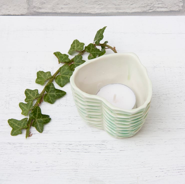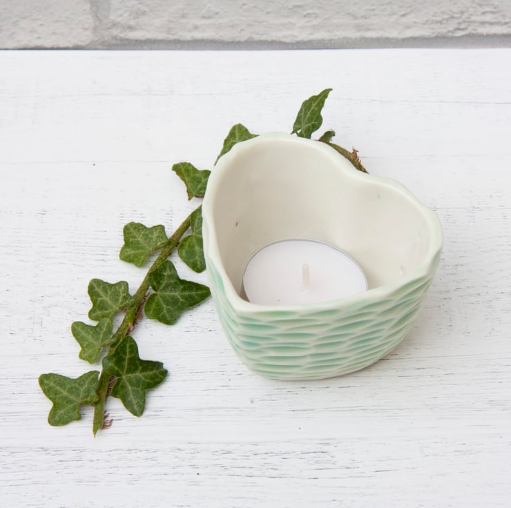 Porcelain heart shaped tealight holder. Each one is carved and the nature of porcelain means that the candle light diffuses through the carvings. Brightness depends on the thickness of the clay or the glaze.