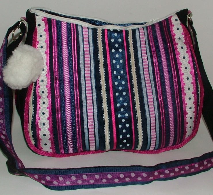 The handbag fastens with a white zip when opened reveals a quilted navy satin lining, which has a funky inside pocket (embellished with more vibrant ribbons)that has makers label. The lining has been hand-stitched in to give a couture finish.