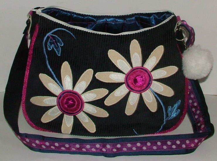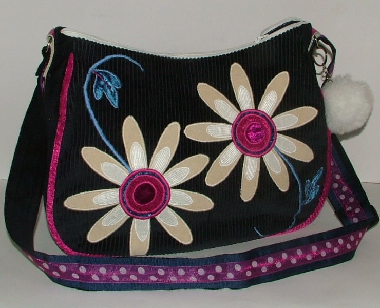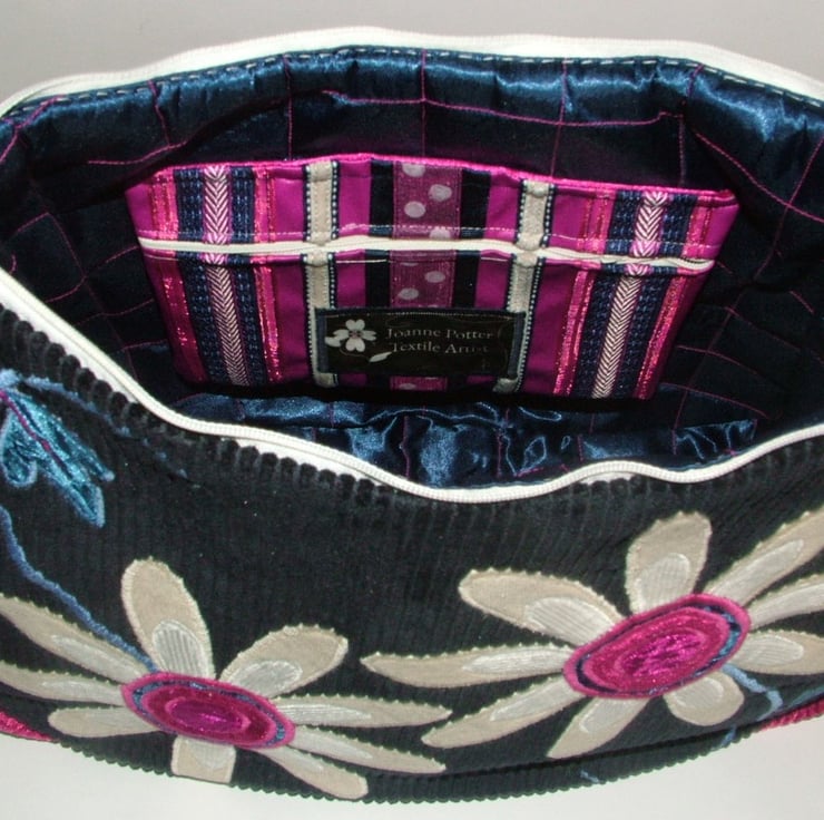 The front is made from a chunky Navy corduroy that has two bold cream and pink daisies with curly blue stalks with textured velvet leaves. The panel is has a pink textured piping