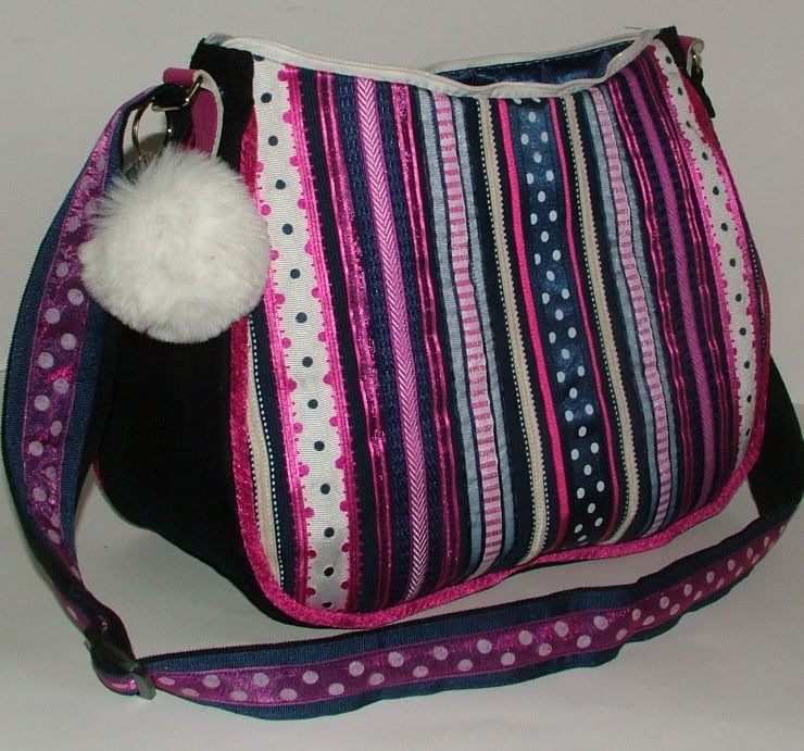 The adjustable shoulder strap is attached to the bag by two pink leather and two metal rings. The strap is made from navy pin cord fabric and a navy and pink spotted ribbon