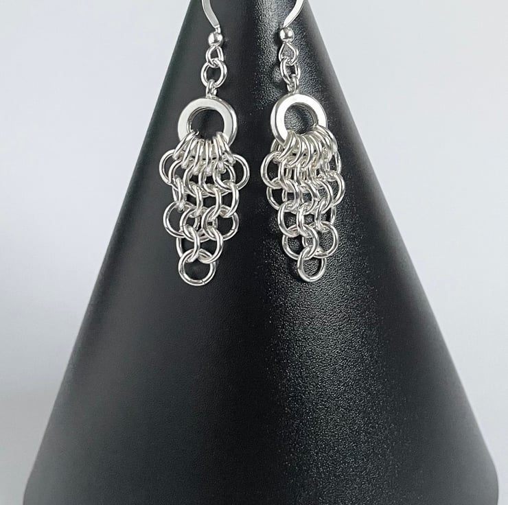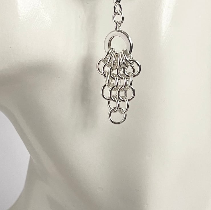 The earrings have a central ring, and from that ring cascades the Chainmaille weave, which consists of individual Sterling Silver rings that have been interlinked to form the graduated design.