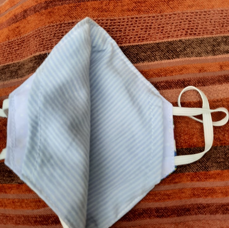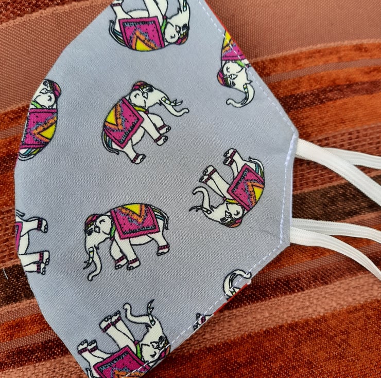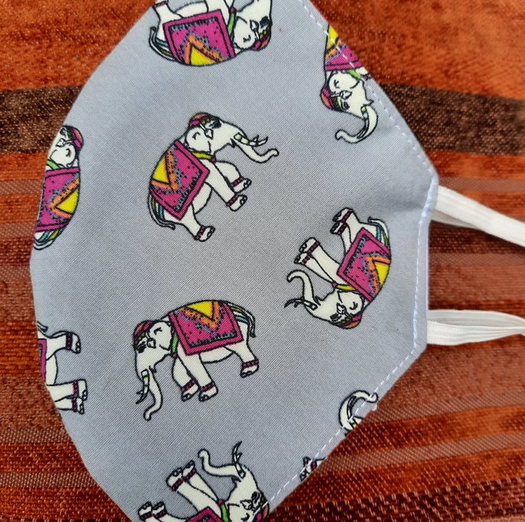 A very cute Indian elephant design fabric for this comfortable handmade reusable facemask, shaped to fit your face with elastic loops, 3 layers of fabric featuring a pocket for an optional filter (not included). You can look stylish in this fun and funky facemask while you are shopping or using public transport. This us not medical grade PPE. 100% of the sale price will be donated to The Gloucester City Mission charity for the homeless