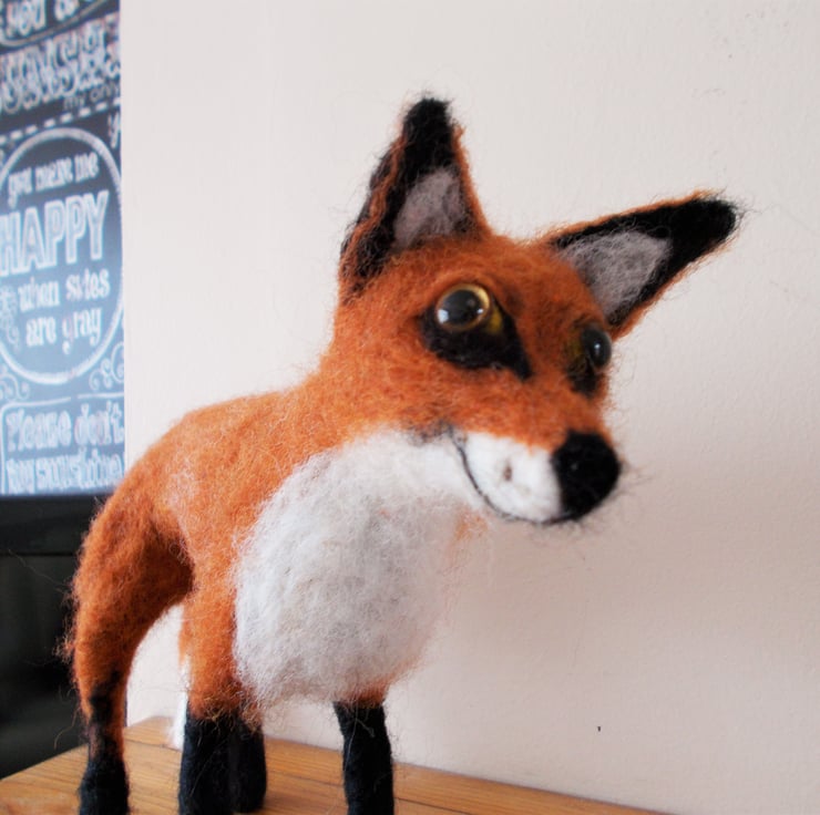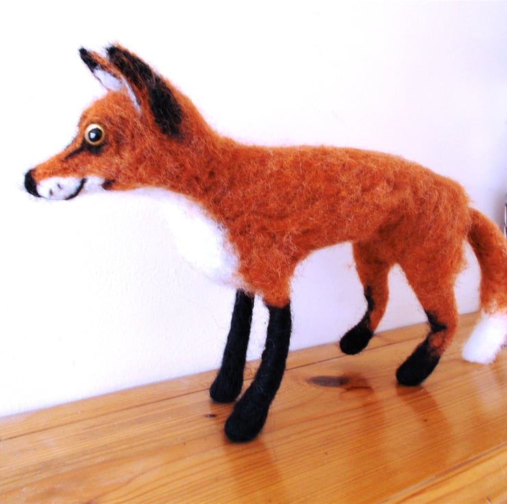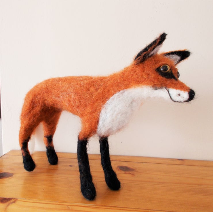 Made from organic sheep's wool with a armature to support . Gorgeous fox with a inquisitive look . About 7.25 inches high and about 11 inches nose to tail. Created in Devon where we have a abundance of these lovely creatures .