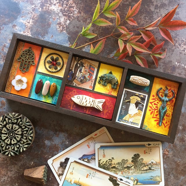 On display are a postage stamp with a portrait by Japanese artist Sharaku and a small section from a Hiroshige playing card. Other items include a Greek Mykonos metal verdigris goddess pendant, filigree hand of hamsa, jewelry findings and beads (Mookaite, Czech pressed glass and a carved bone bead in the shape of a fish).