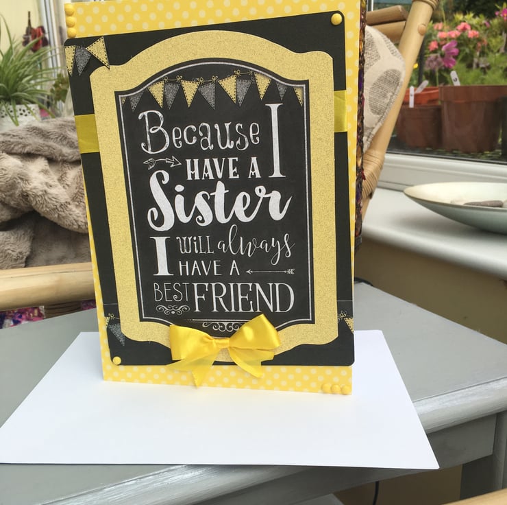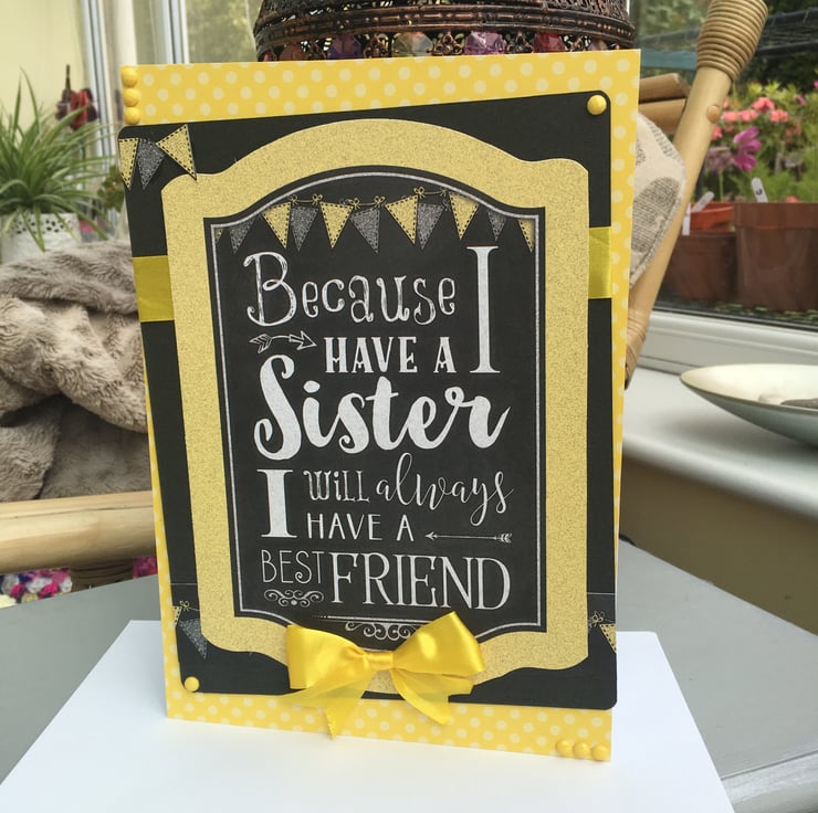 This 7x10in card is a vibrant celebration of sisterhood. Bright yellow polka dots with a blackboard and bunting topper that says 'Because I have a sister I will always have a best friend'. It is topped off with a sunshine yellow bow and yellow facited gems.