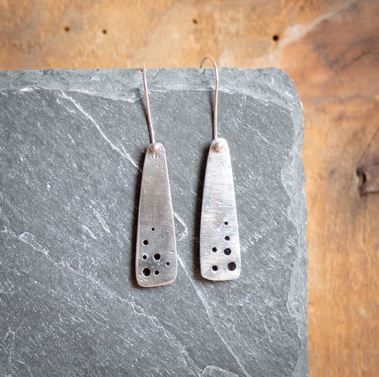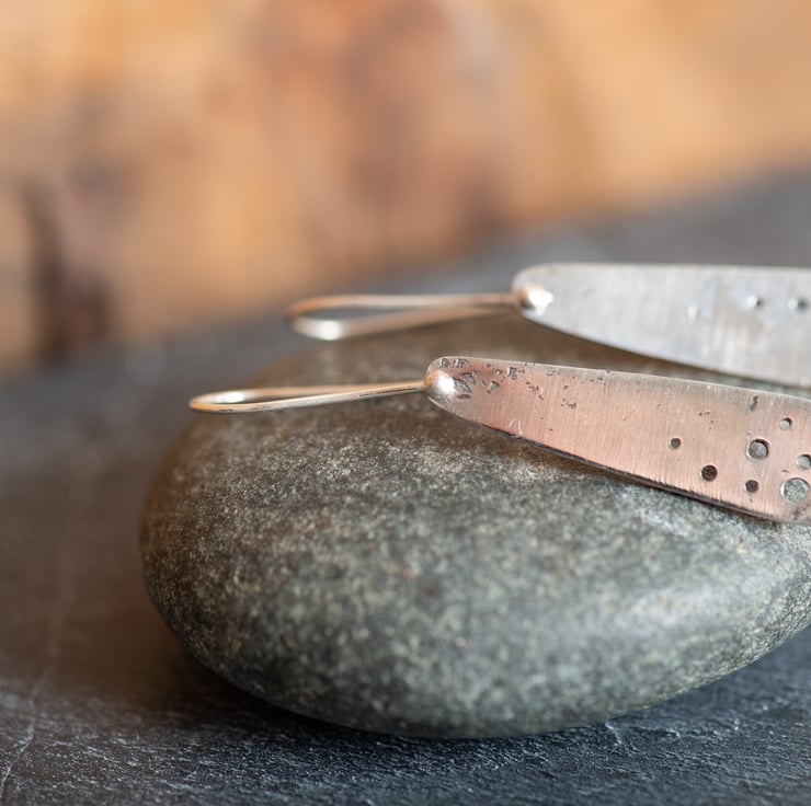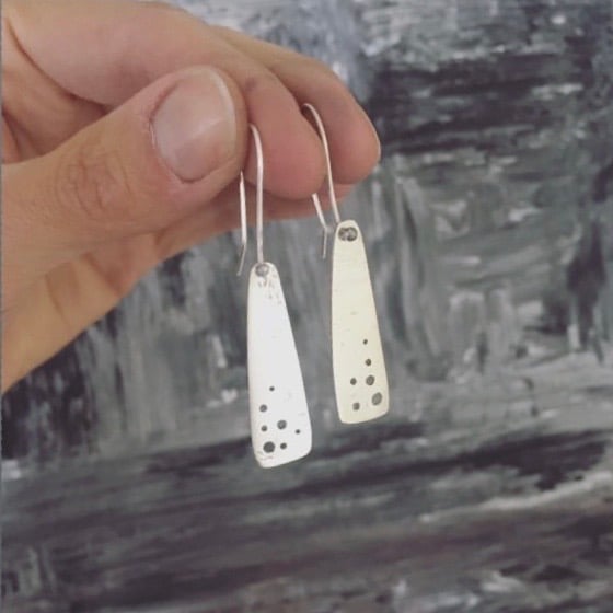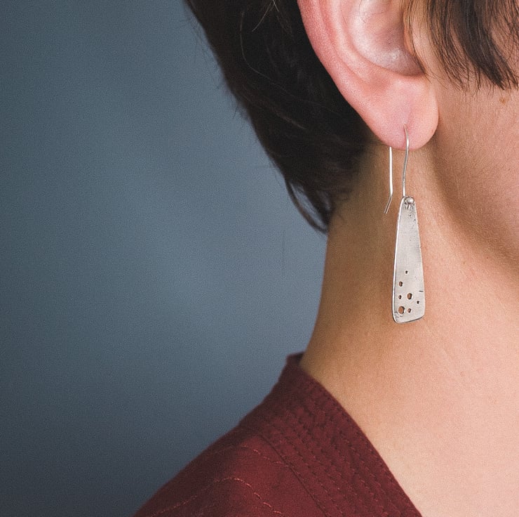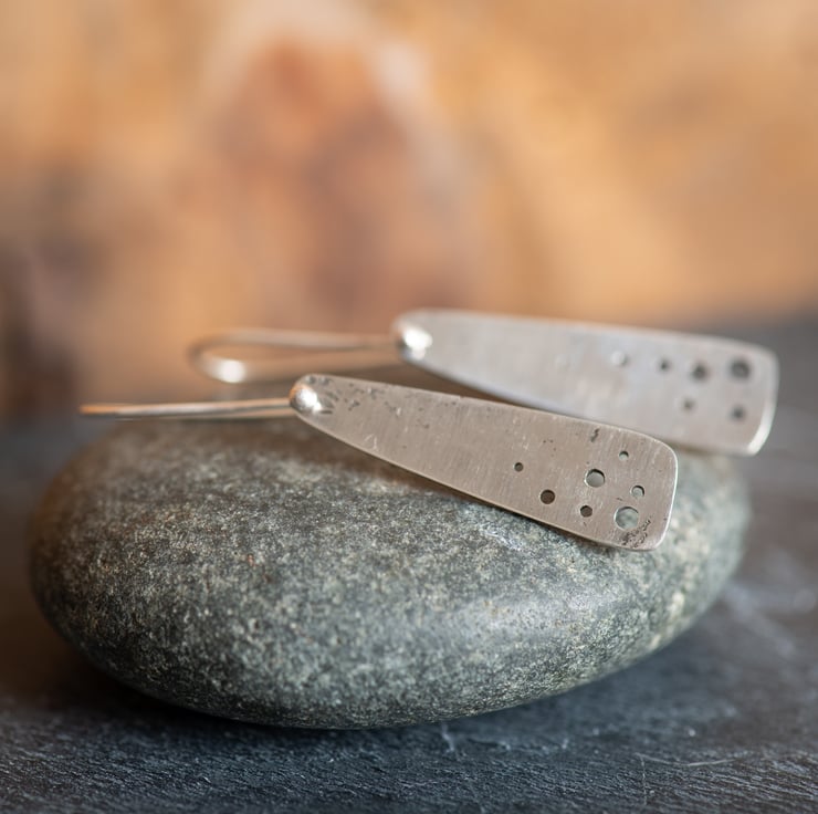 I used the traditional method of saw piercing to hand cut out the shapes from silver, and I have then sawn little circle details onto each one. The earrings have been oxidised to darken, and then polished to show off the texture. (I texture these by hammering them against concrete- I love the interesting impressions this leaves.)