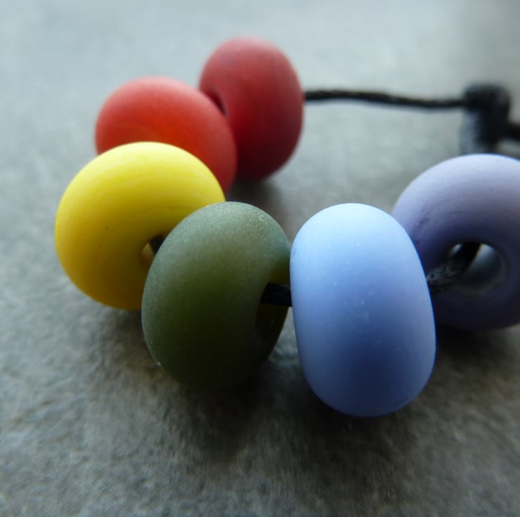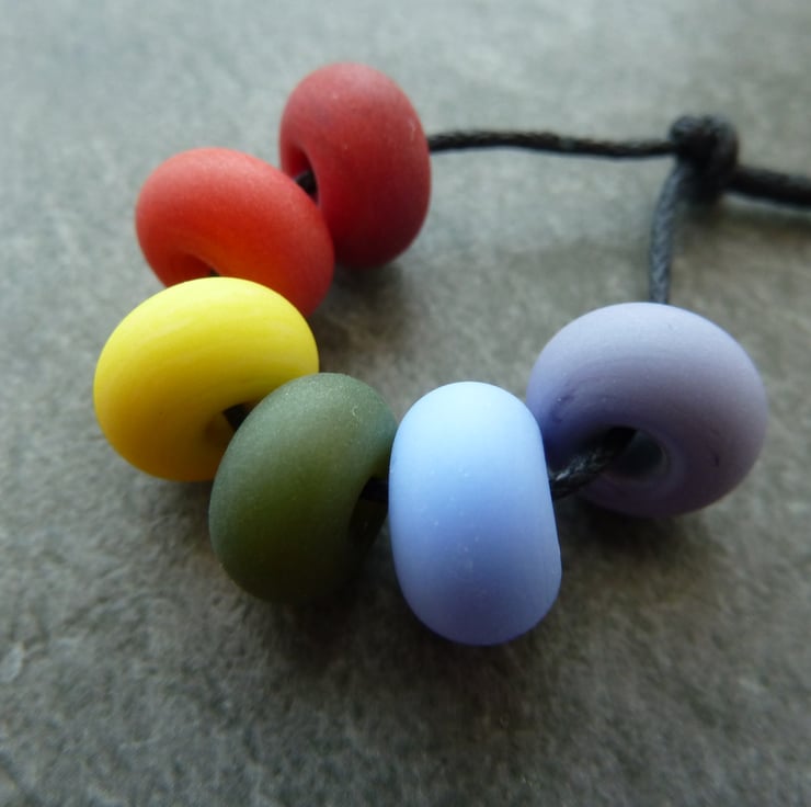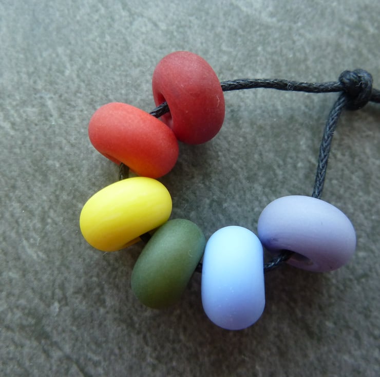 A set of 6 lampwork glass spacer beads made with red, orange, yellow, green, blue and purple glass. They have been tumbled to give a smooth finish.