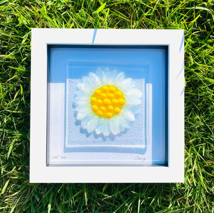 Fused glass 3 dimensional daisy in a white box frame which is 15cm x15cm . Ready to hang . Made to order so please allow one week for delivery . The glass is beautifully contoured and reflects the light beautifully. The centre is made by
