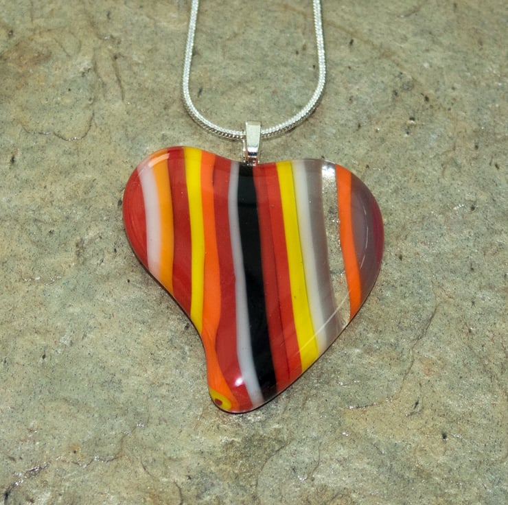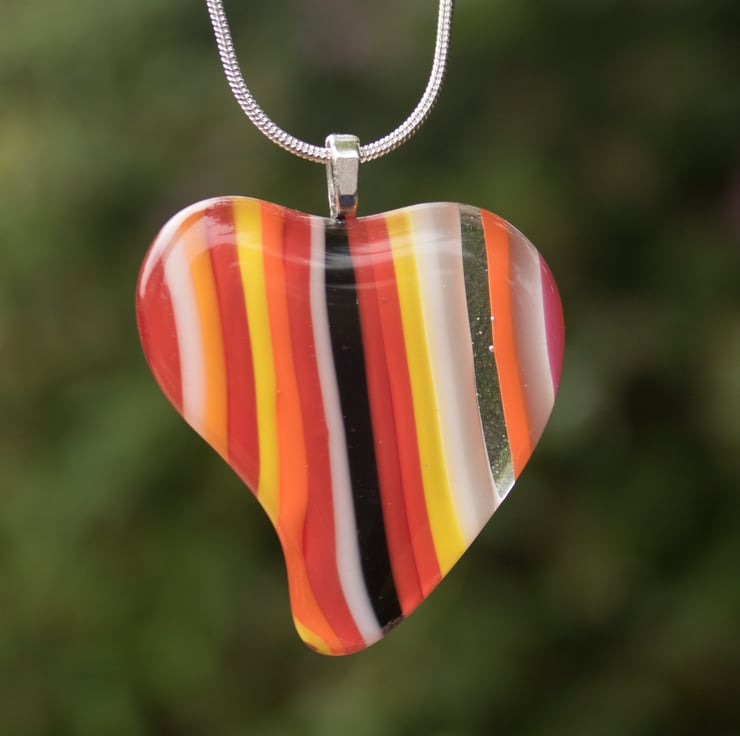 Stringers are thin glass rods, which we use to construct the sheet of glass from which this pendant is hand-cut. The piece is then fired in the kiln with temperatures reaching around 800C. Once cooled we glue on a silver coloured bail, and thread the chain.