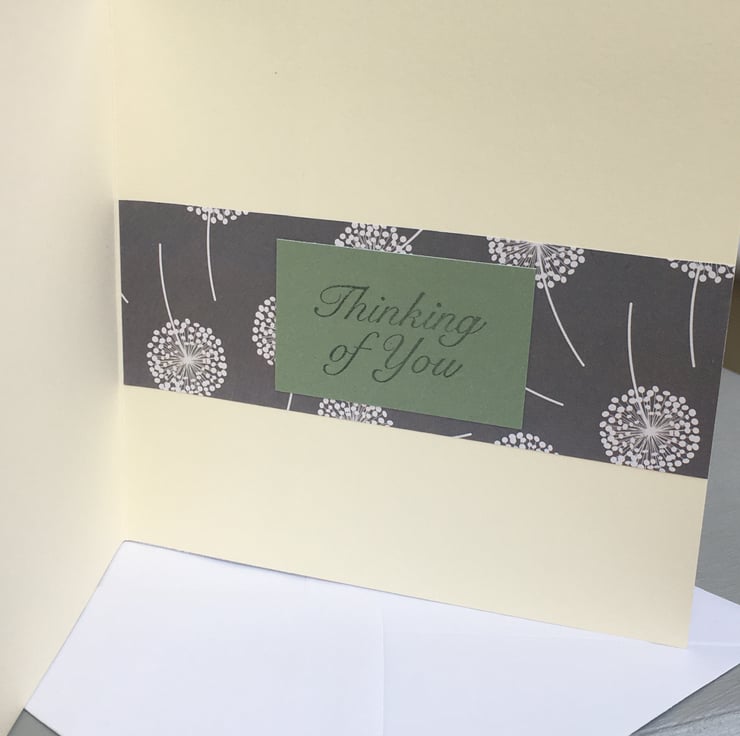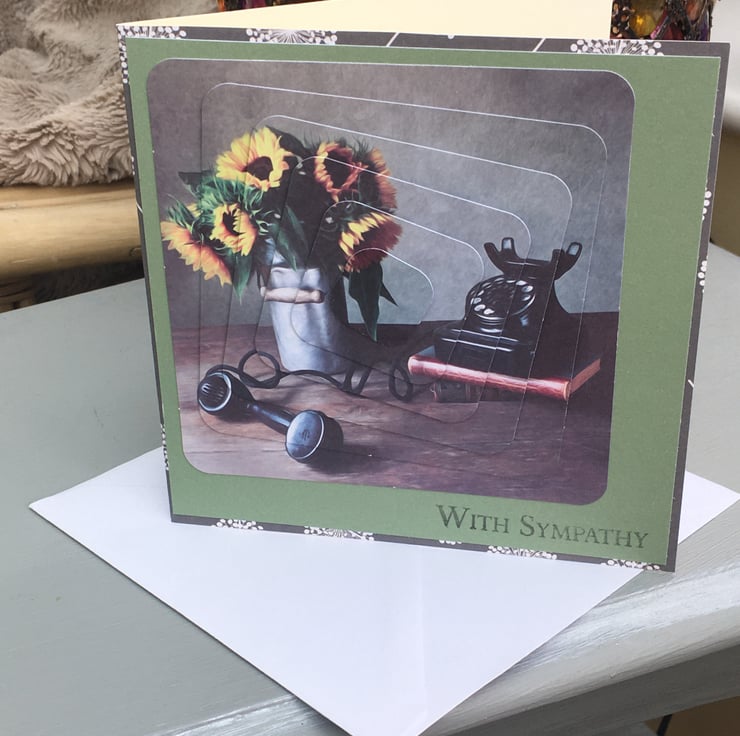A simple twisted pyramid card depicting a vase of sunflowers and an old fashioned telephone. The wording on the front says a simple 'With sympathy'. Inside has 'Thinking of you' on matching papers. The card is 6x6in square. The topper is backed onto green paper and then onto grey and white dandelion seed head printed paper.